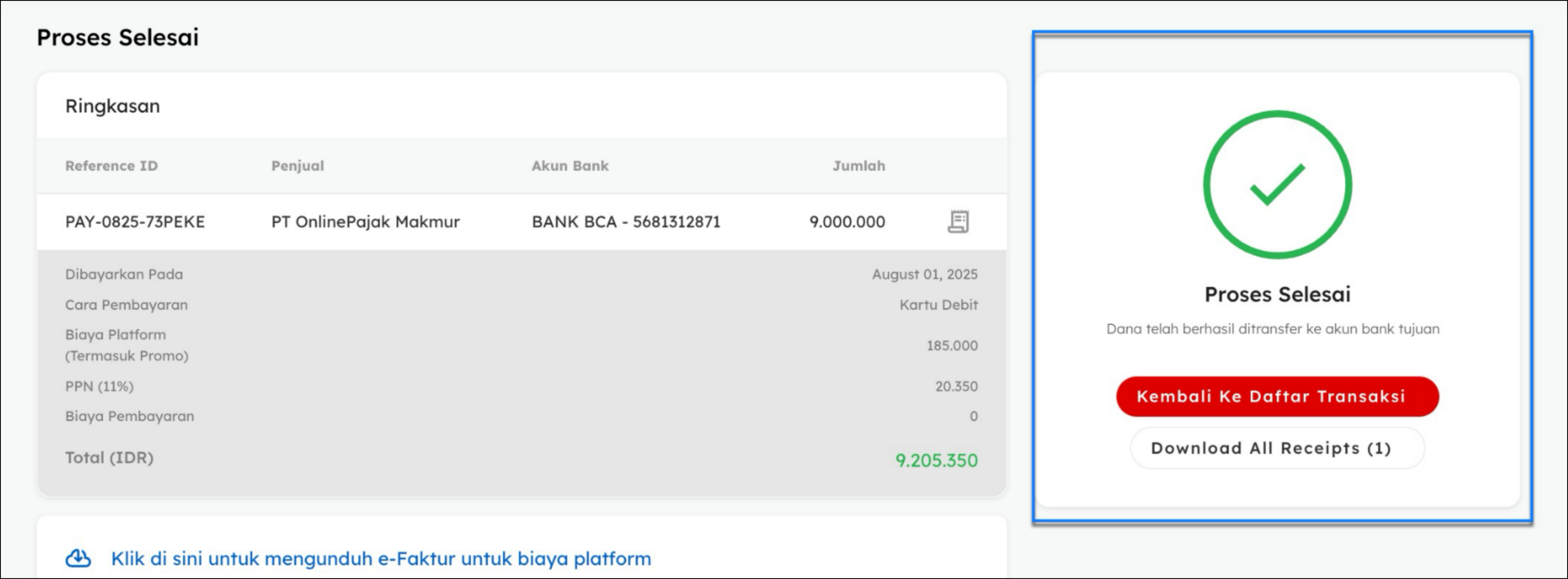 Setelah pembayaran berhasil, maka akn muncul keterangan Proses Selesai dan Anda dapat mengirimkan bukti pembayaran tersebut dengan klik Download All Receipt.