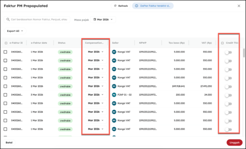 - Akan muncul list Faktur Pajak Masukan yang telah dibuat oleh lawan transaksi Anda, Anda bisa memilih transaksi FP mana yang ingin di unggah dengan cara centang kotak Creditable. Jika sudah, Silakan klik tombol Unggah untuk menarik data FP Masukan tersebut ke list transaksi Pembelian Anda