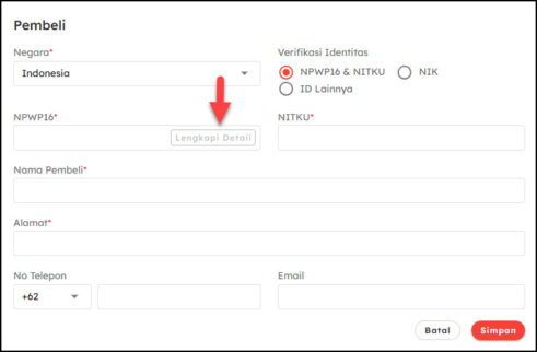 Masukkan NPWP 16 digit pembeli, lalu klik Lengkapi Detail.
