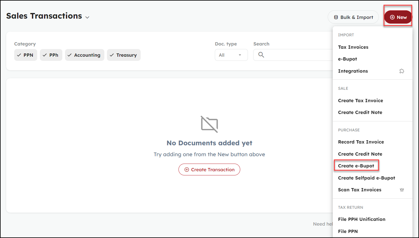 Log in to your OnlinePajak account. Click on the Transactions menu, then click on the +New button and select the Create e-Bupot option.