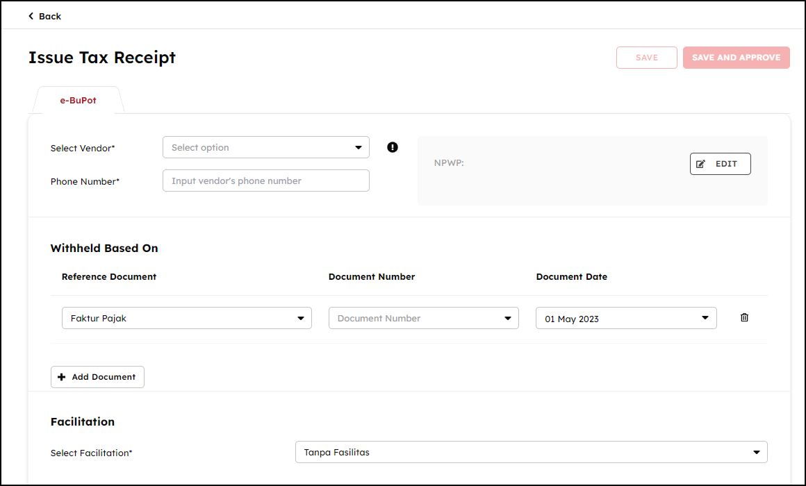 Next, complete the Tax Facilities and Object section. If the counterparty does not have supporting facilities (such as a Free Letter of Recommendation or a facility borne by the Government), please select “without facilities” and complete the Object of Tax (make sure the details you fill in are in accordance with the transaction stated in the reference document), then click the Save button.