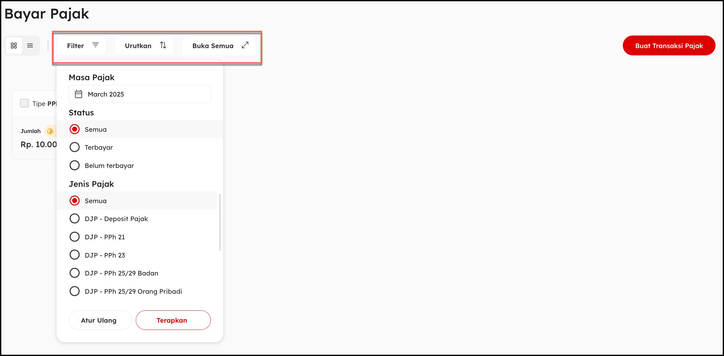 Gunakan fitur Filter untuk menentukan periode pajak, status ID Billing, dan kriteria lainnya sesuai kebutuhan.