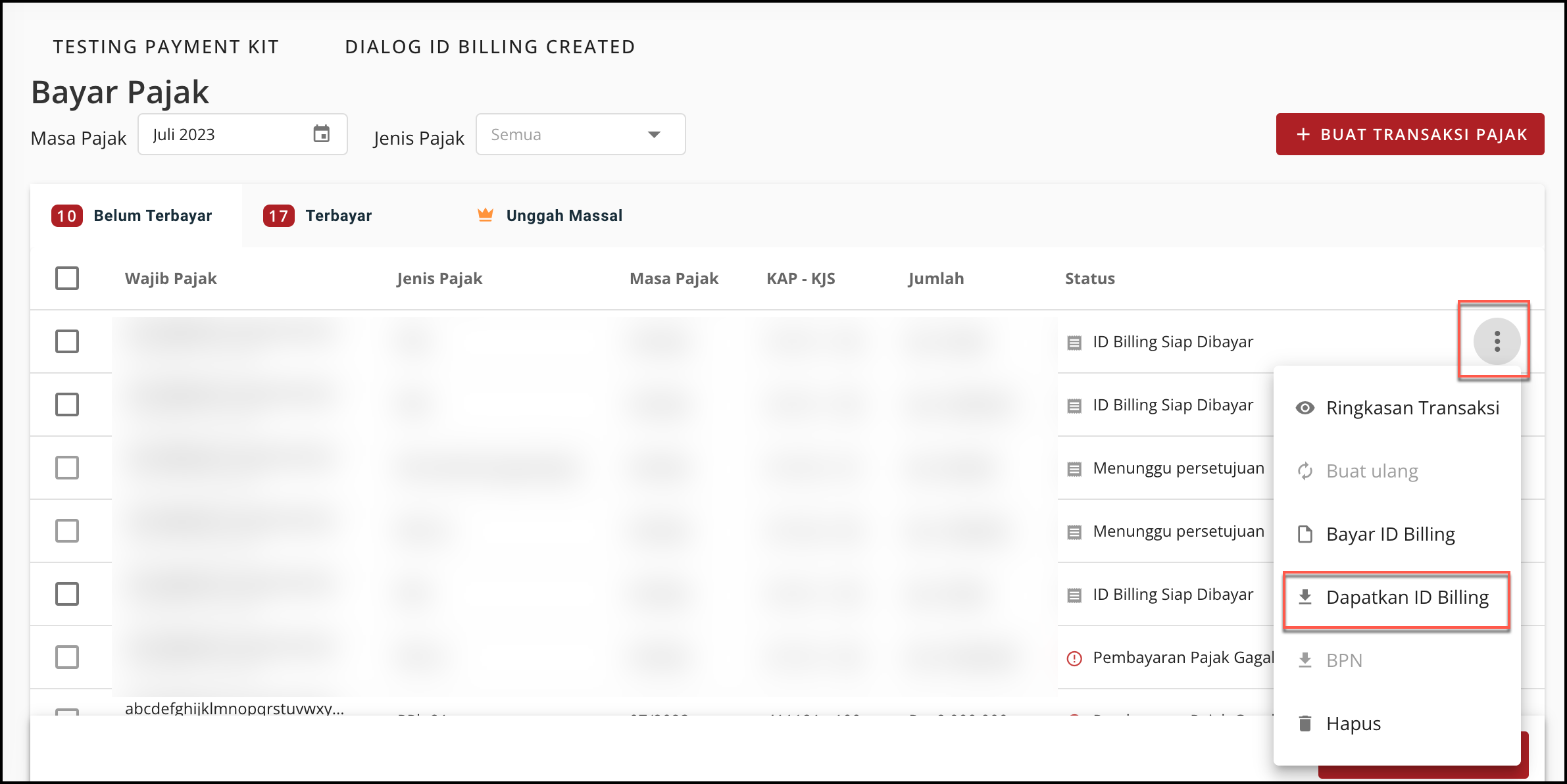 - Klik icon tiga pada ID Billing yang akan di cetak, kemudian pilih Dapatkan ID Billing,