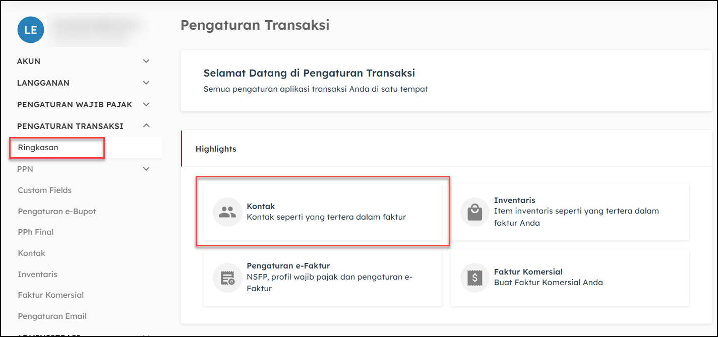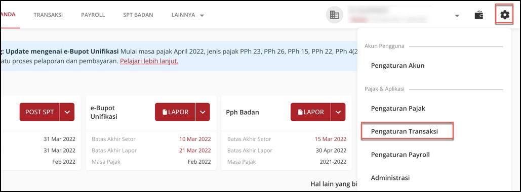 - Pilih icon Gear, kemudian klik Pengaturan Transaksi,