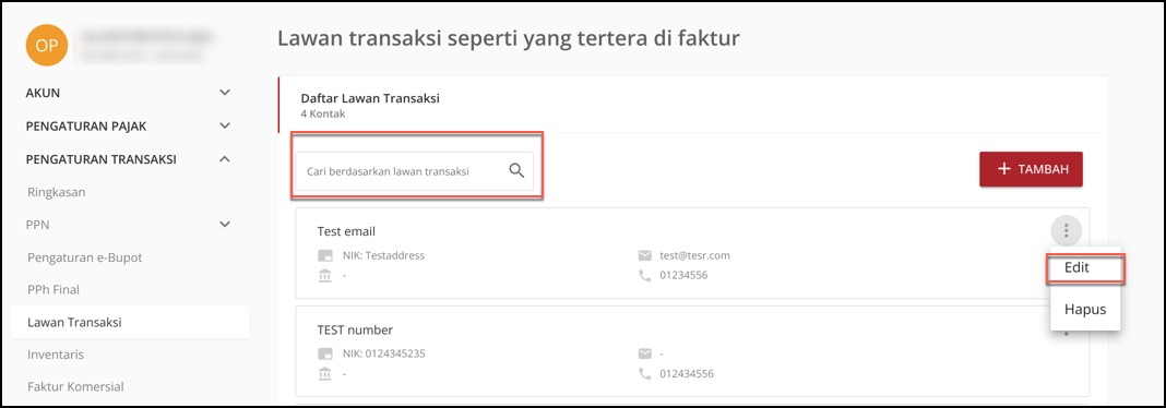 - Ketik Nama Lawan Transaksi, kemudian pilih Edit,