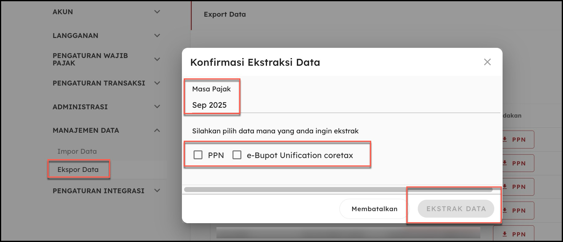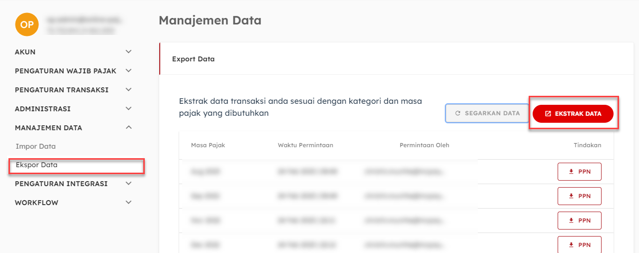 - Saat ini untuk ekstrak data hanya tersedia untuk PPN, klik “PPN” kemudian pilih masa pajak dan klik “Ekstrak data”