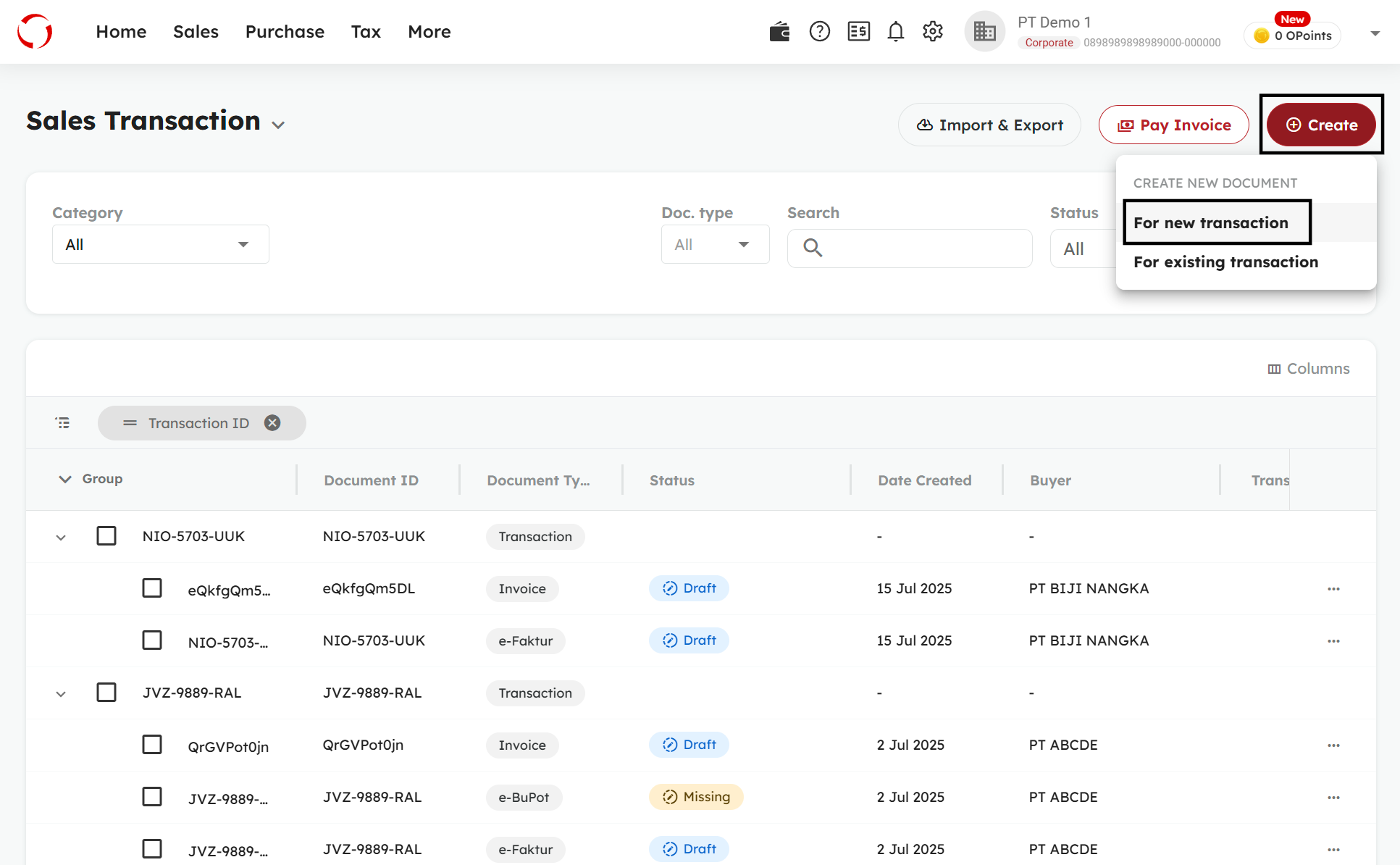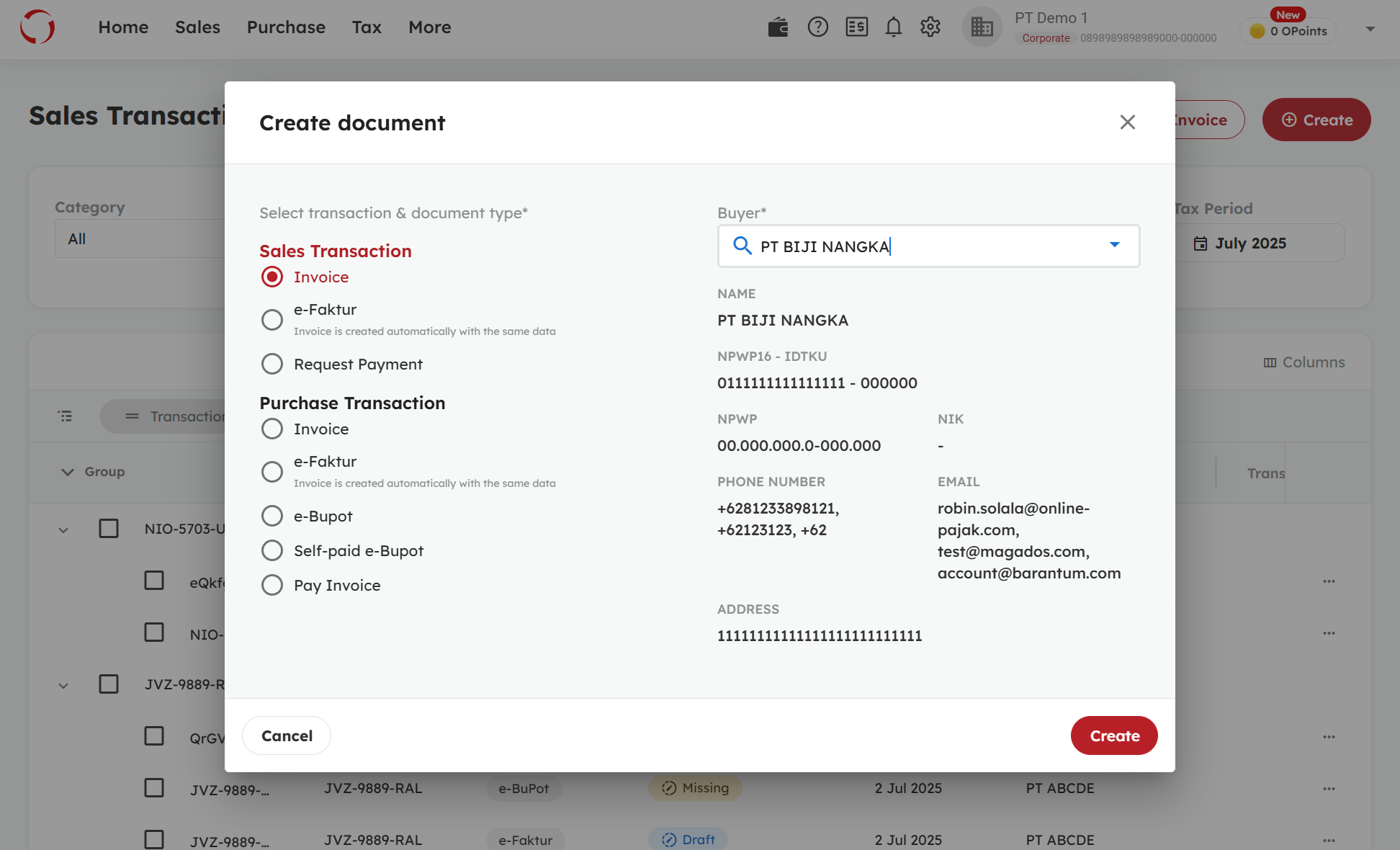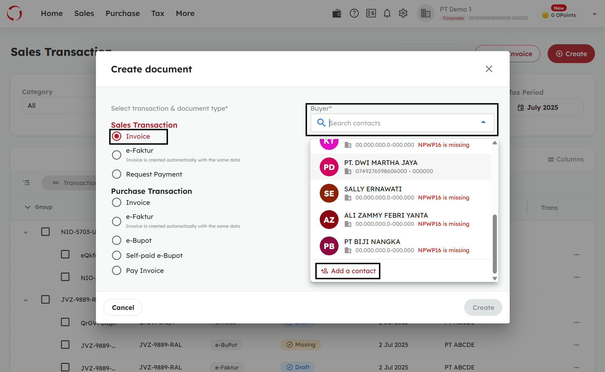 Select the transaction type, choose or create a new buyer, then click the ‘Create‘ button