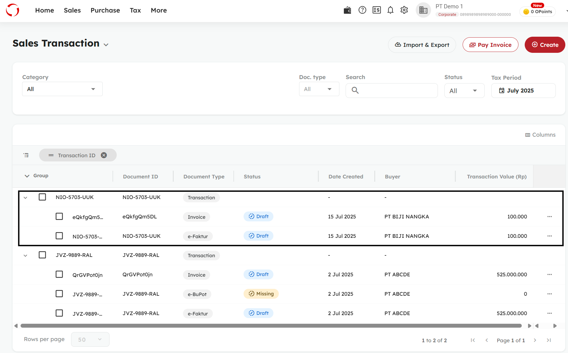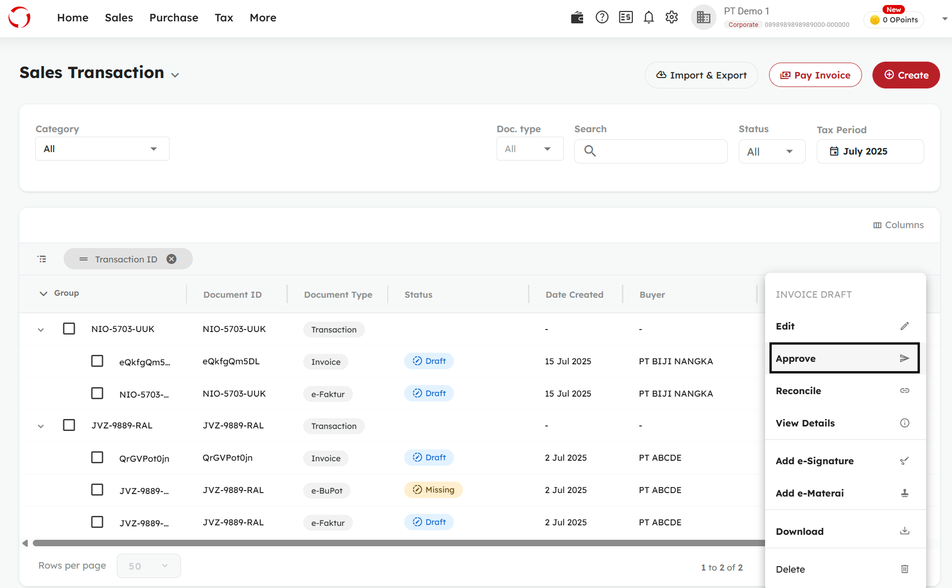 - After completing all transaction details, you can return to the transaction list to see your transaction recorded as a draft