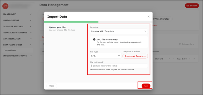 Step 2: Upload your prepared XML file. (You may also download an XML template from this page.) Then click Next.