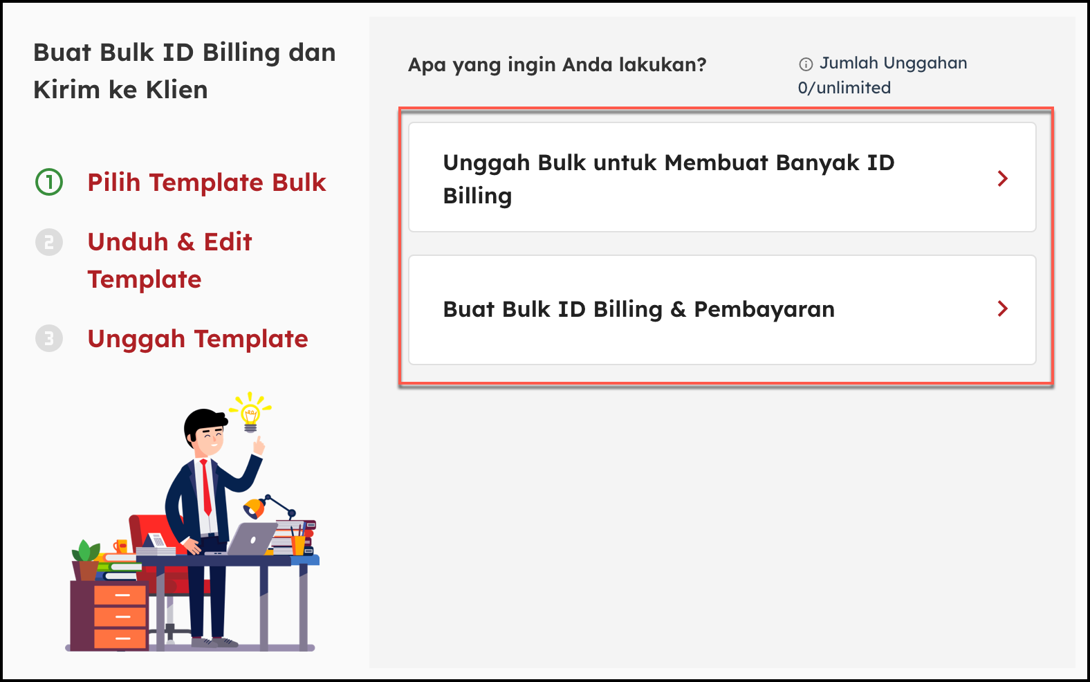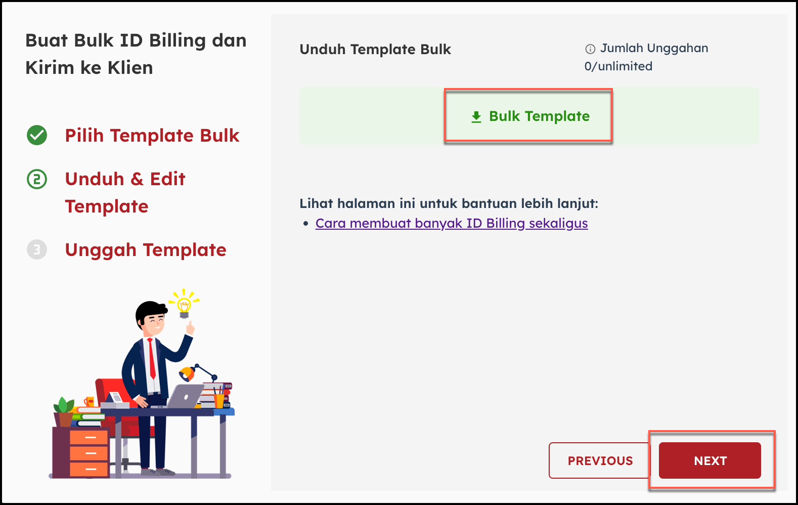 Setelah klik “Buat Bulk ID Billing dan kirim ke Klien”, Jika Anda belum memiliki template bulk ID Billing, Anda bsia mengunduh dan edit template dengan klik “Bulk Request Template”