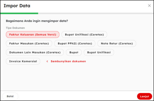 Pilih jenis dokumen yang ingin Anda import, kemudian klik Lanjut.