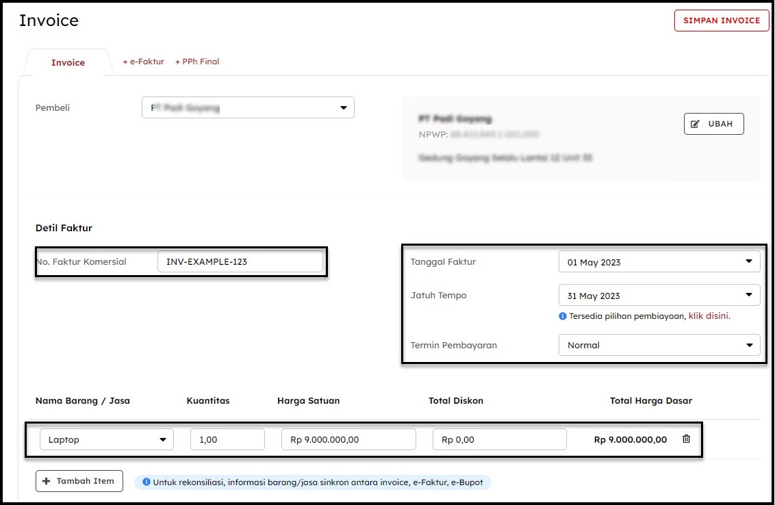 - Selanjutnya Anda akan dialihkan ke tab Pembuatan Commercial Invoice. Lengkapi data yang dibutuhkan meliputi : Nomor Faktur Komersil, Tanggal Faktur, Jatuh Tempo, Termin Pembayaran dan juga Lengkapi kembali Nama Barang / Jasa, Kuantitas, Harga Satuan. Anda bisa menambahkan satu atau lebih item Barang/Jasa