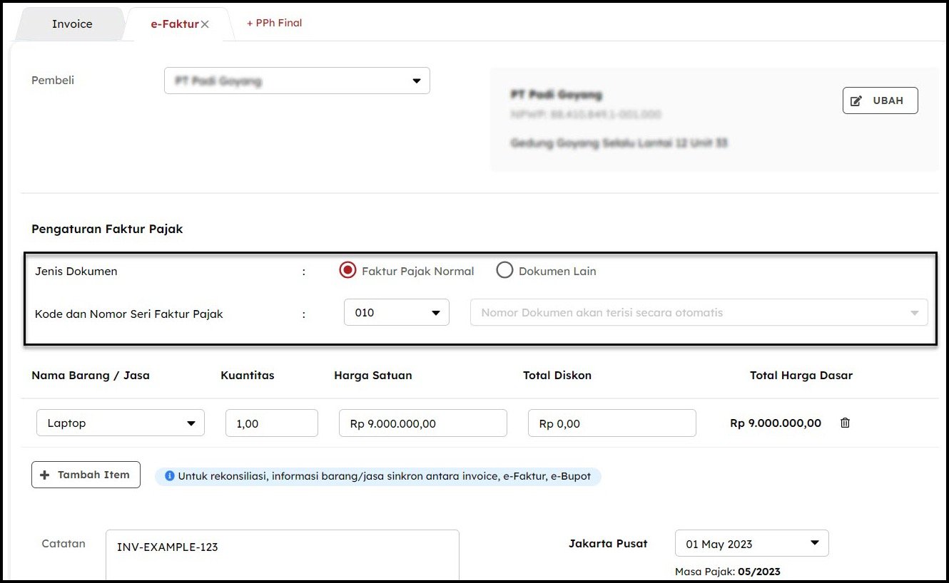 - Jika data pada Tab Invoice sudah lengkap dan sesuai, silakan klik tab Efaktur untuk membuat Faktur Pajak atas Invoice tersebut. Pada tahap ini Anda cukup mengisi bagian Pengaturan Faktur Pajak terkait Jenis Dokumen dan Nomor Seri Faktur Pajak