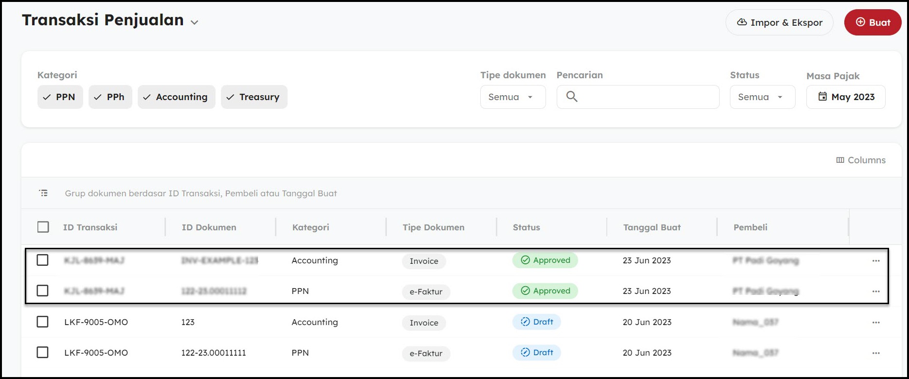 - Kemudian Anda akan dialihkan ke halaman awal Daftar Transaksi, Untuk memudahkan mencari transaksi Anda, Anda dapat melakukan pemilihan data dengan kriteria tertentu menggunakan Filter by : Category, Status Document and Tax Period. Anda juga bisa menggunakan kolom pencarian untuk menemukan transaksi yang diinginkan.