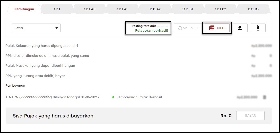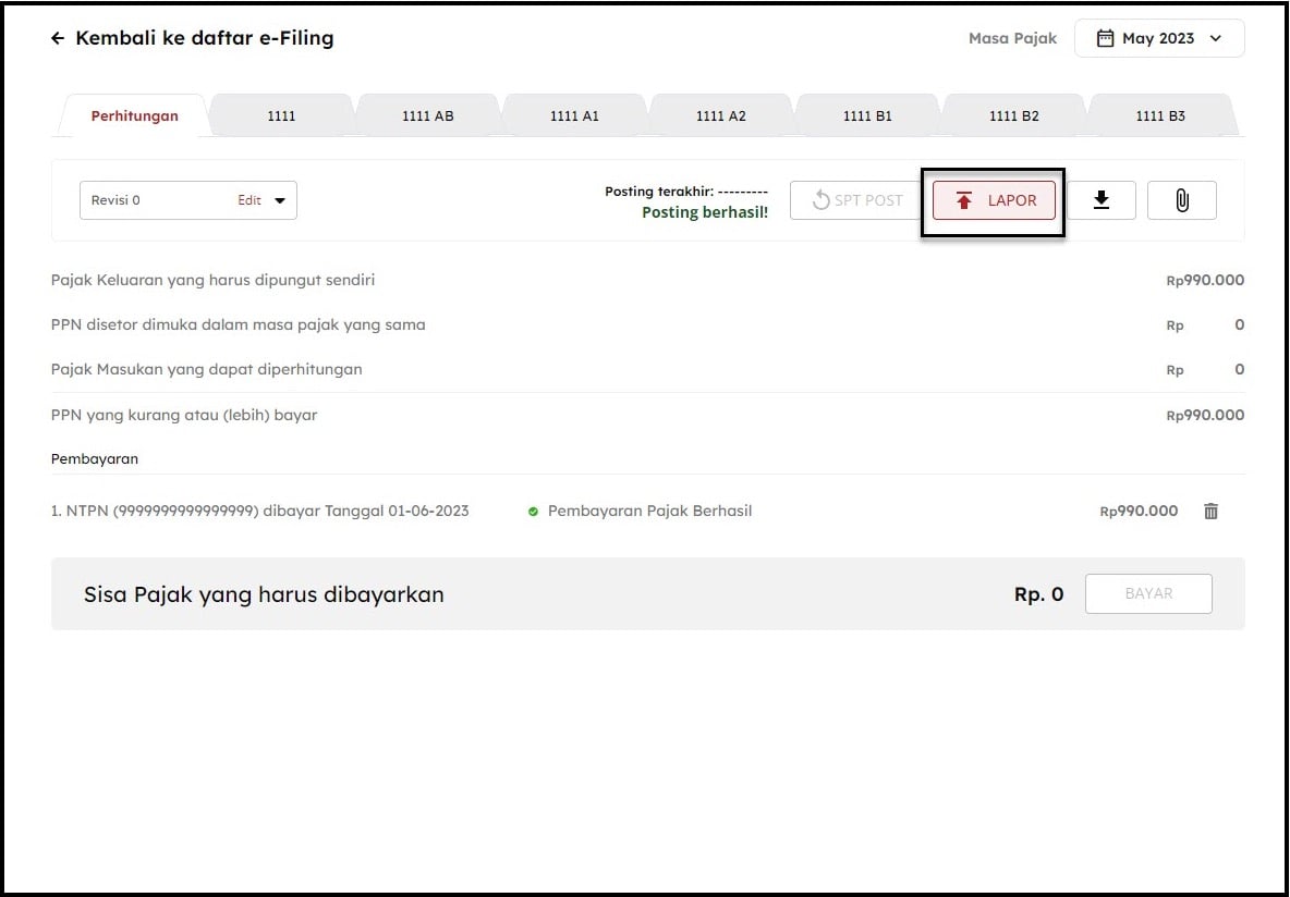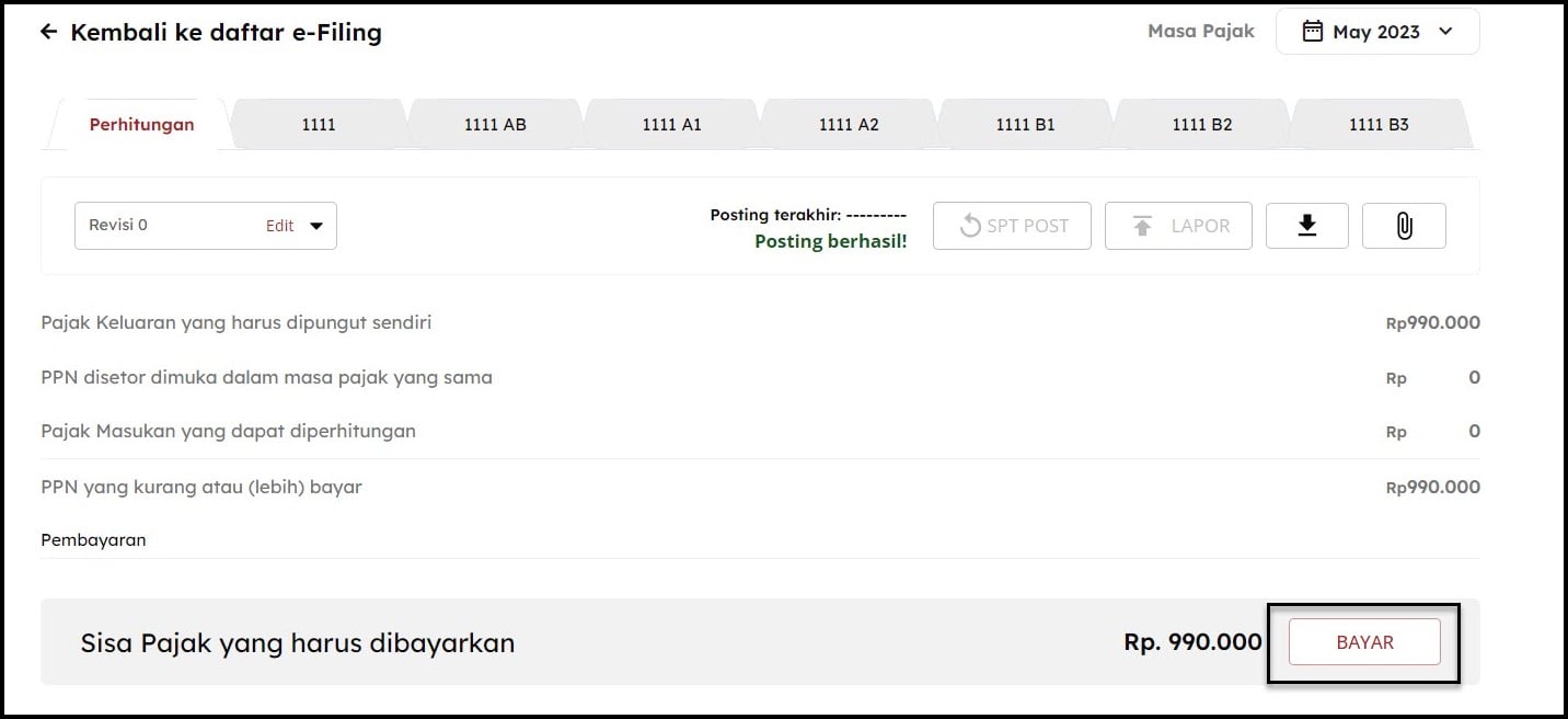 - Tunggu dan Refresh halaman hingga status Posting Berhasil, Jika Posting berhasil akan munculdetail Nominal Pajak Kurang/Lebih bayar yang harus Anda selesaikan pada Masa tersebut