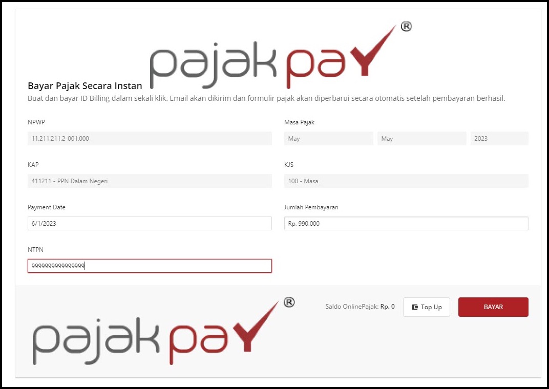 - Jika terdapat Pajak Terutang, Silakan lakukan Pembayaran Pajak dan Input NTPN atas pembayaran tersebut dengan cara klik tombol Bayar, Lengkapi detail pembayaran meliputi : Tanggal Bayar, NTPN dan Nominal Pembayaran lalu klik Simpan.