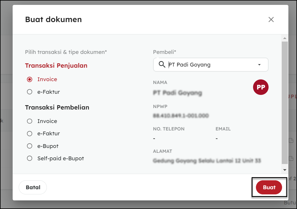 - Anda akan diminta untuk menyesuaikan Dokumen yang ingin dibuat, Jenis Transksi (Penjualan / Pembelian) dan Tipe Dokumen (Invoice, Efaktur, Ebupot & Self Paid e-Bupot) Lalu pilih Lawan Transaksi Anda . Lalu klik Buat