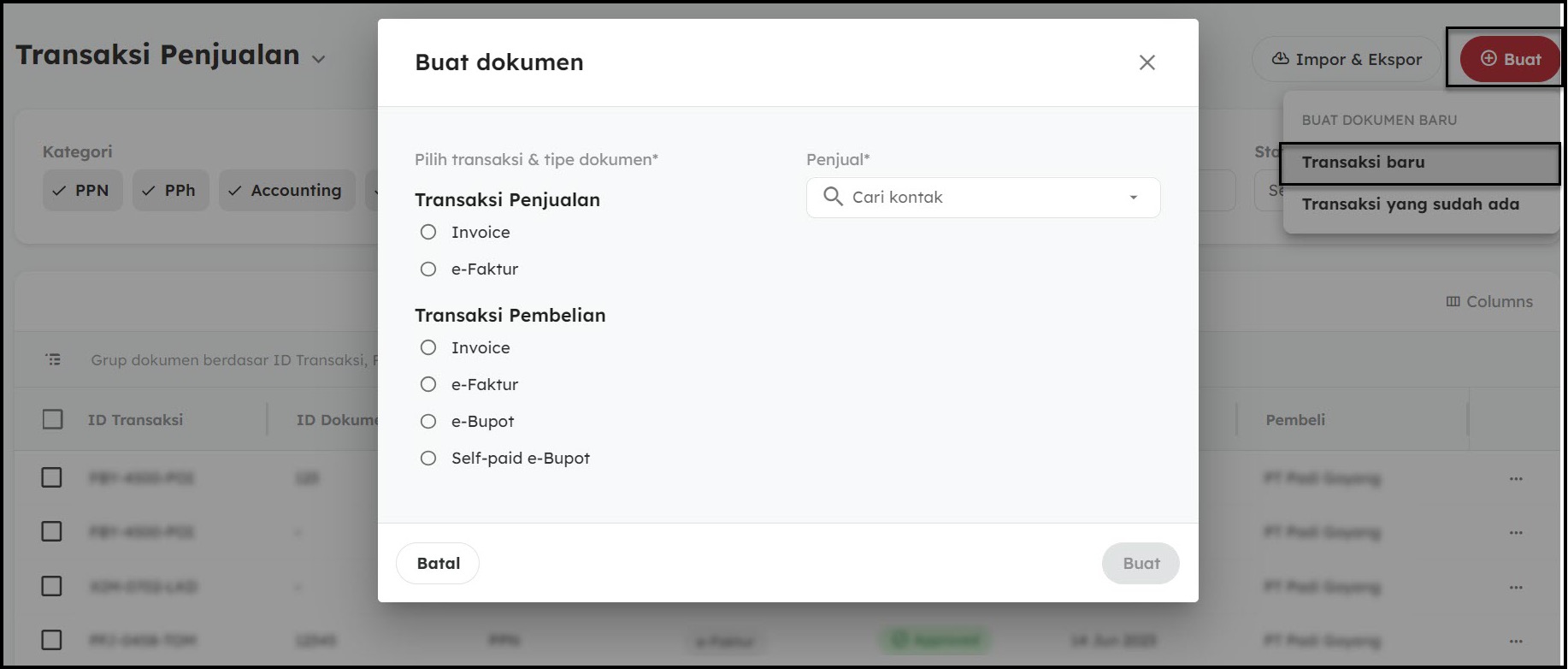 - Masuk Menu Transaksi – Buat – Transaksi Baru untuk mulai membuat Dokumen
