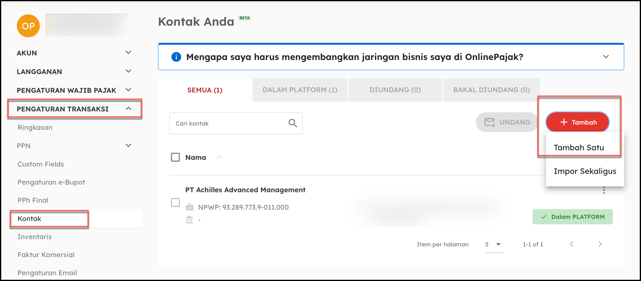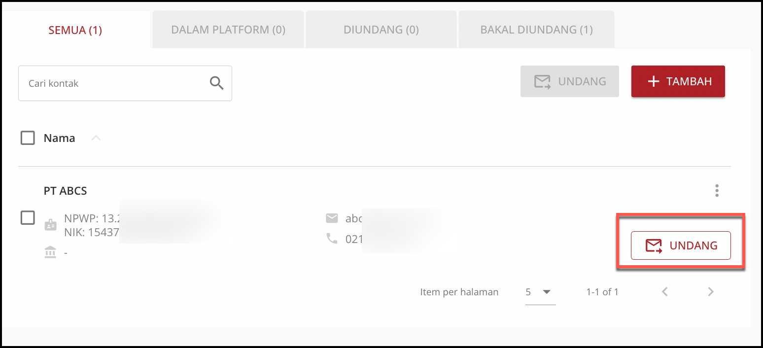 Jika Anda akan mengundang lawan transaksi tersebut untuk menggunakan aplikasi OnlinePajak, maka cukup klik tombol Undang. Maka transaksi yang dibuat oleh Perusahaan Anda ataupun Lawan Transaksi akan tersinkronisasi secara otomatis.