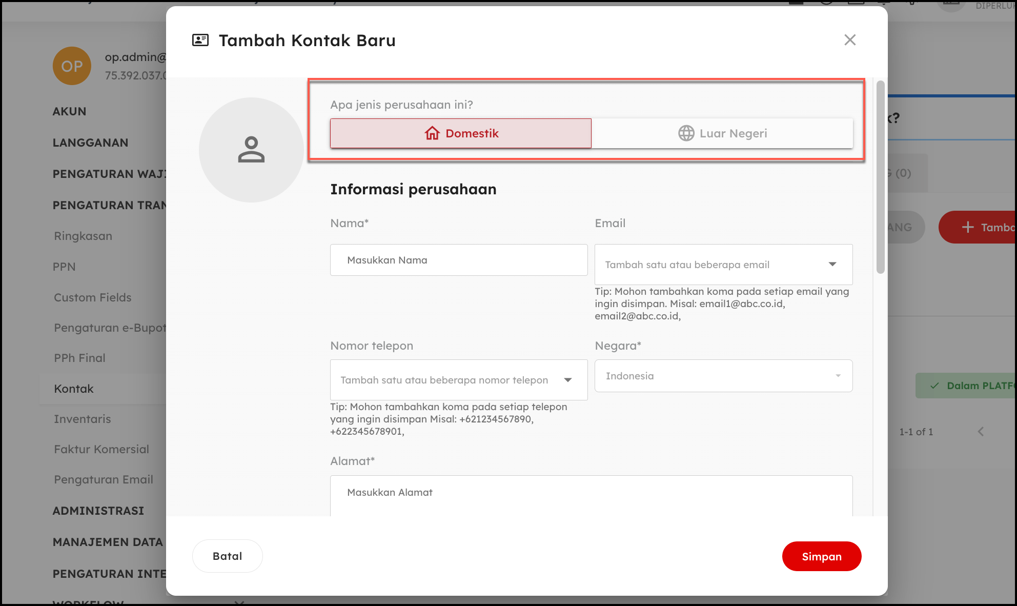- Klik menu +Tambah, pilih Domestik atau Luar Negeri Setelah itu lengkapi Detail Kontak,