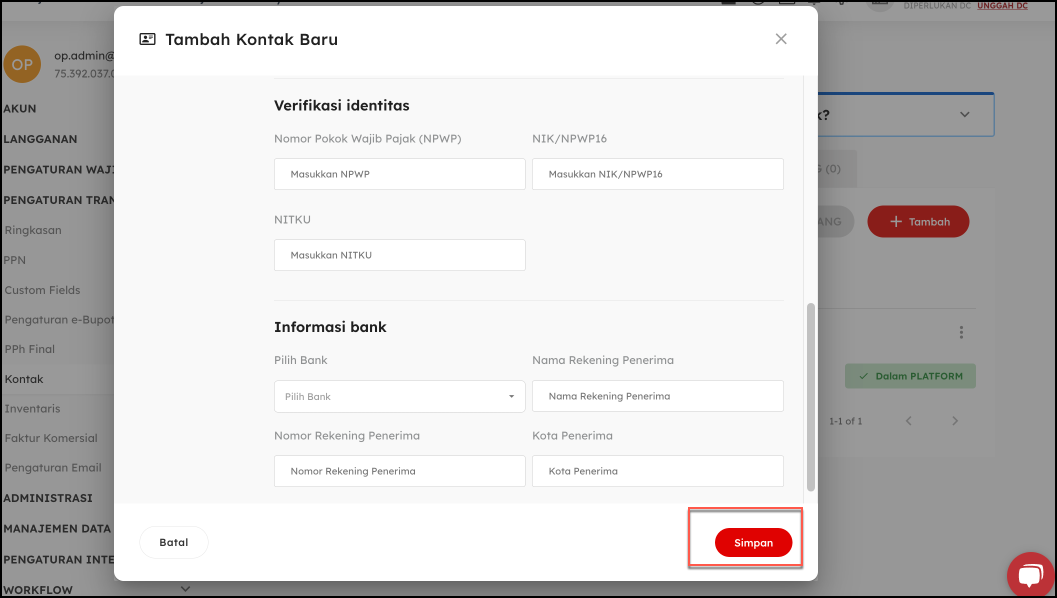 - Lengkapi NPWP (jika lawan transaksi tidak memiliki NPWP, maka dapat di ketik 00.000.000.0-000.000), NIK/NPWP16 dan (Optional pada bagian bagian Akun Bank). Jika sudah dilengkapi, klik Simpan,