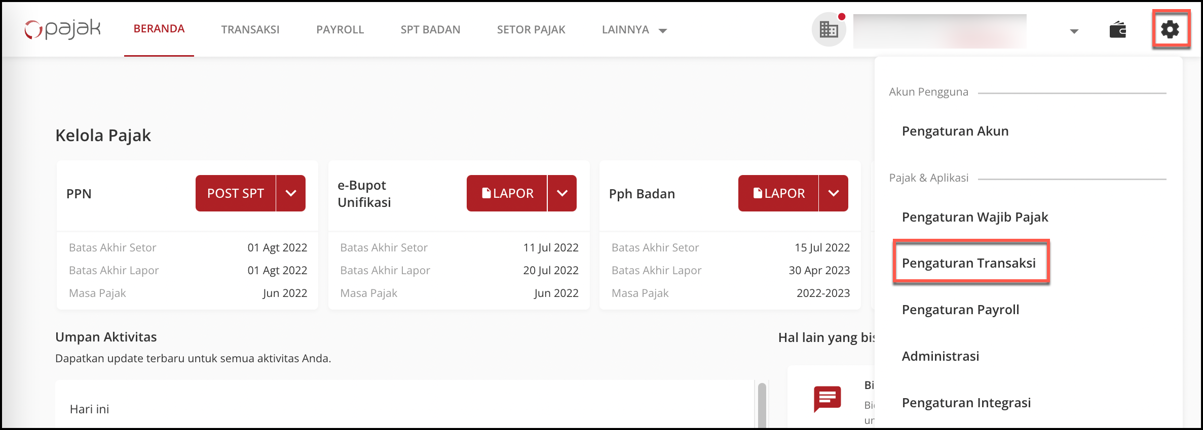 - Setelah Anda Login, lalu klik icon Gear, dan klik menu Pengaturan Transaksi,