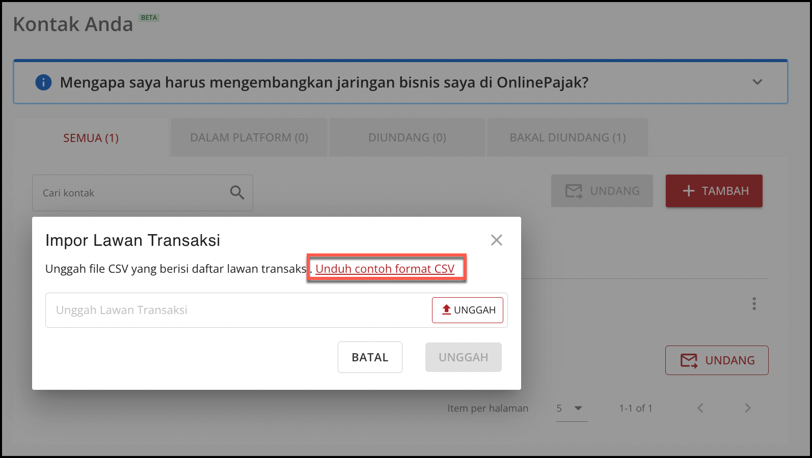 - Jika Anda memiliki banyak lawan transaksi, dan akan upload secara bersamaan, maka klik unduh contoh format CSV, Setelah Anda lengkapi unggah kembali file csv tersebut, setelah itu klik tombol Unggah.