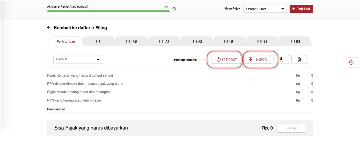 - Klik tombol SPT Post untuk kalkulasi periode tersebut, dan tunggu hingga proses posting selesai, setelah itu klik tombol Lapor;