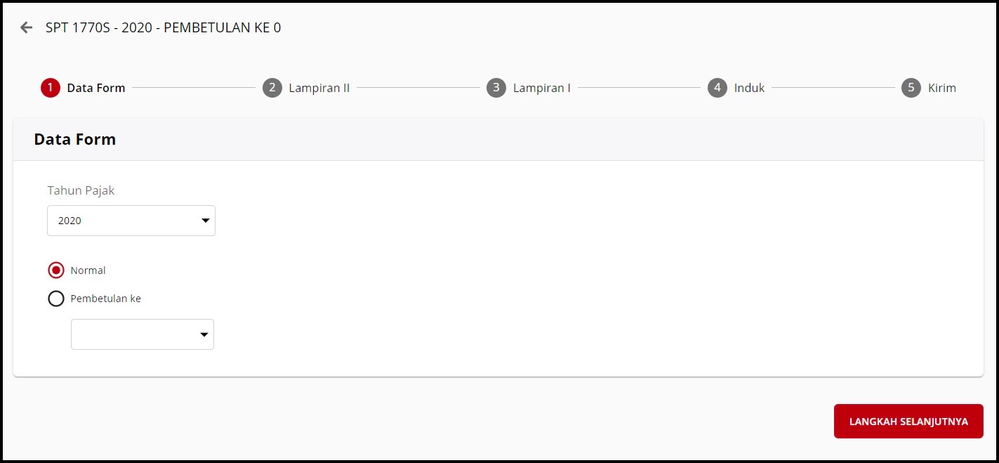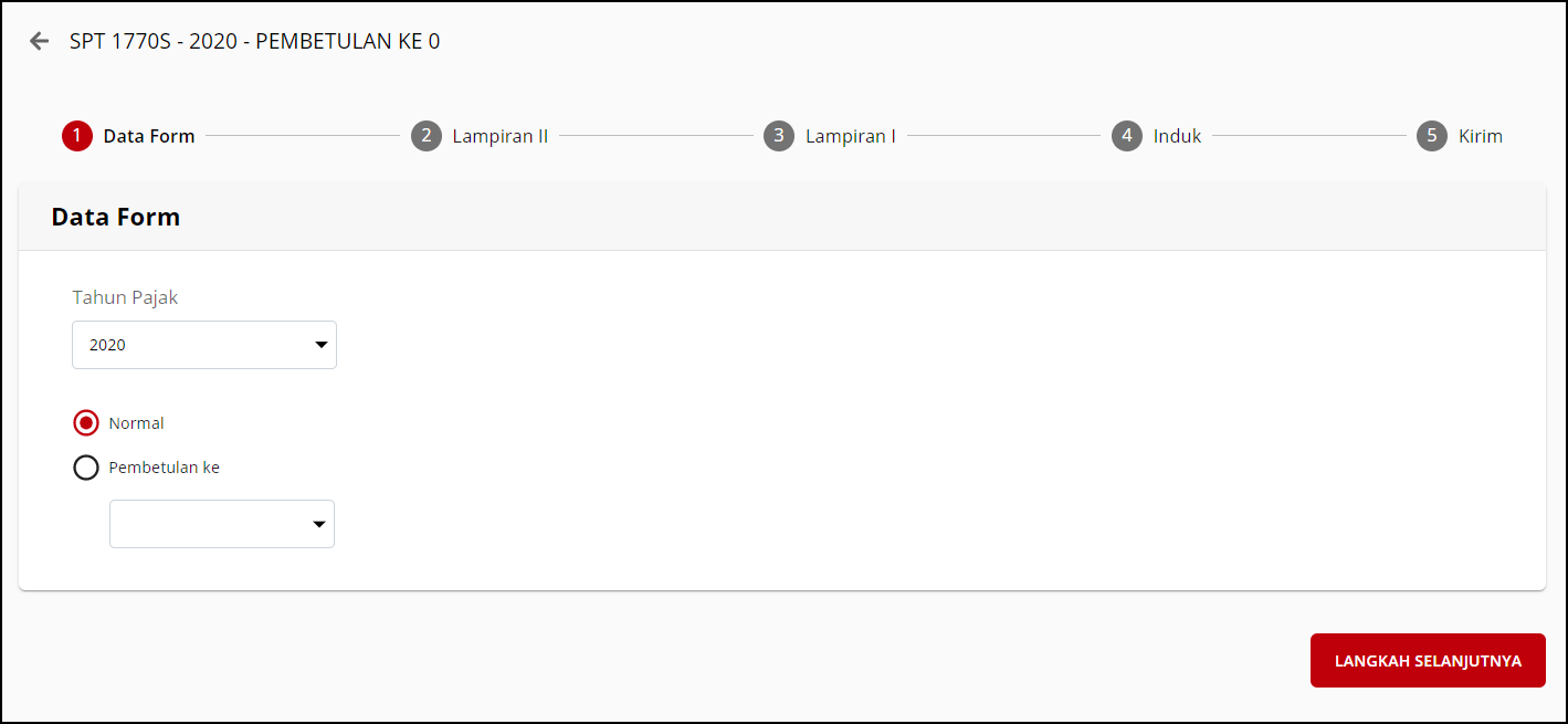 6. Pilih ‘Tahun Pajak’ dan menentukan apakah pelaporan SPT Anda ‘Normal” atau ingin melakukan “Pembetulan ke”. Klik “Langkah Selanjutnya”