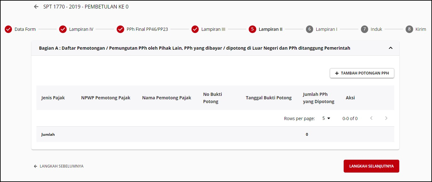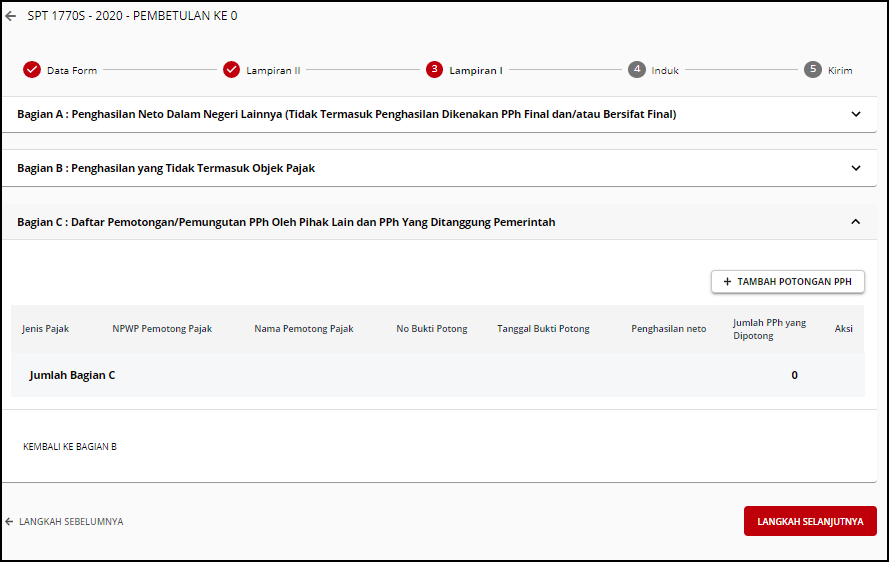 - Bagian A: Daftar Pemotongan/Pemungutan PPH Oleh Pihak Lain, PPH yang dibayar / dipotong di luar negeri dan PPH Yang ditanggung Pemerintah. Jika sudah lengkap klik “Langkah Selanjutnya”