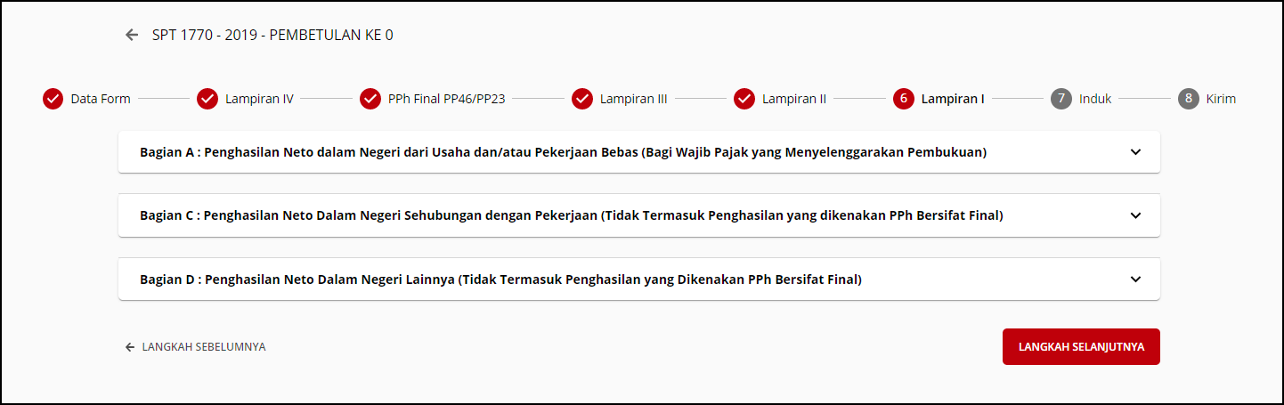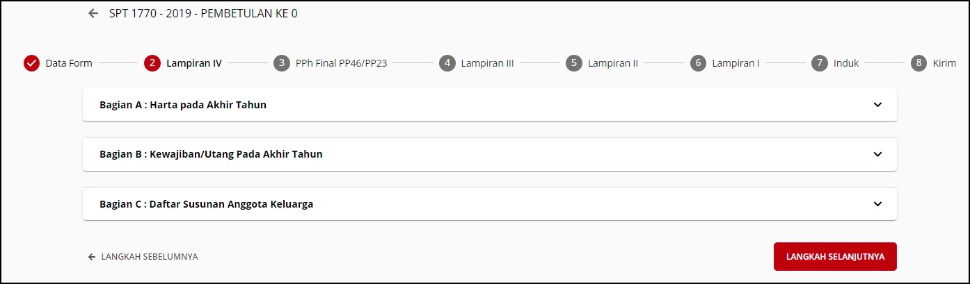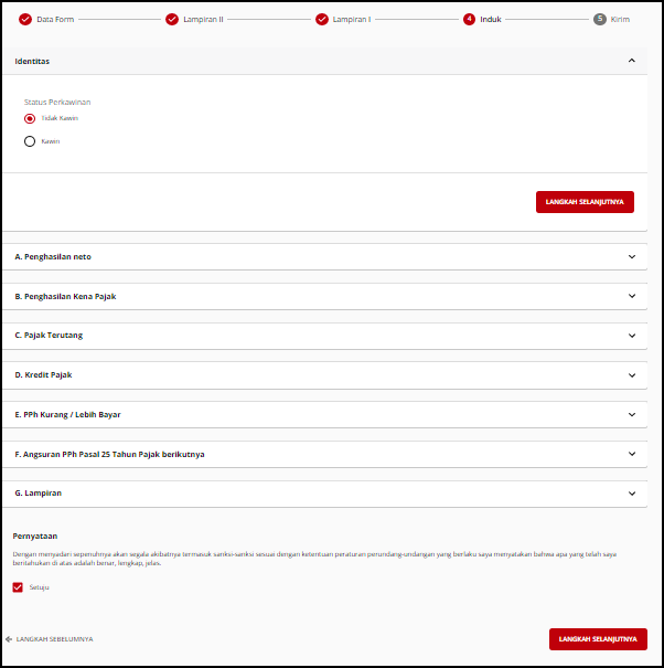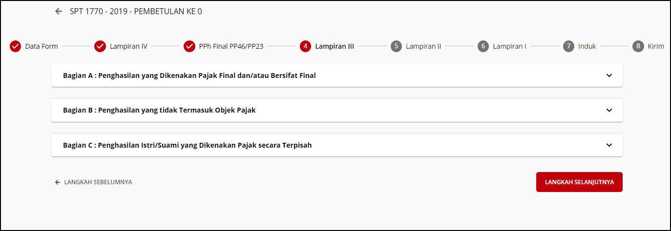 - Bagian C : Penghasilan Istri/Suami yang Dikenakan Pajak Secara Terpisah. Jika sudah lengkap klik “Langkah Selanjutnya”