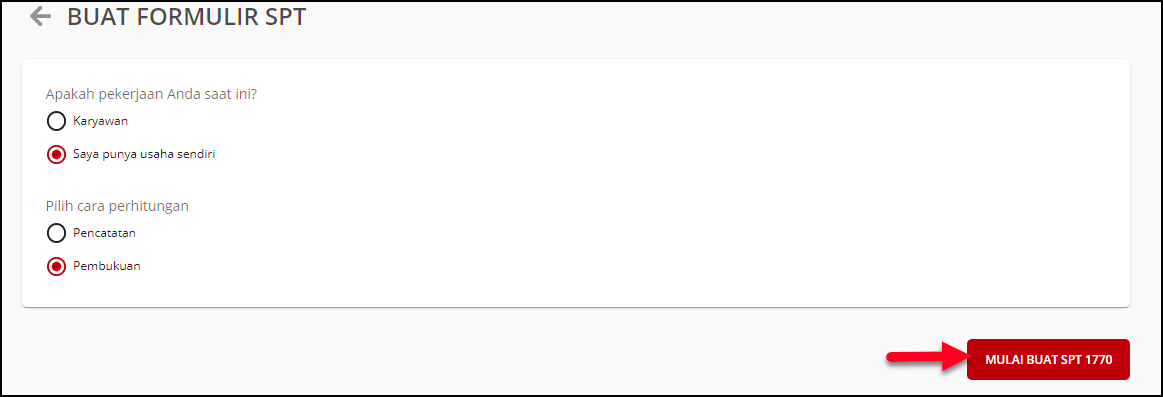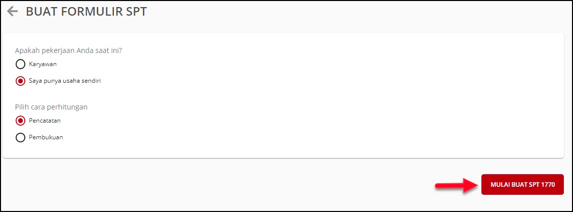 5. Jika Sudah Klik tombol “Create SPT” atau “Buat SPT Tahunan”. Jika Anda memiliki usaha dan memilih cara perhitungan “Pembukuan”, silakan klik “Mulai Buat SPT 1770