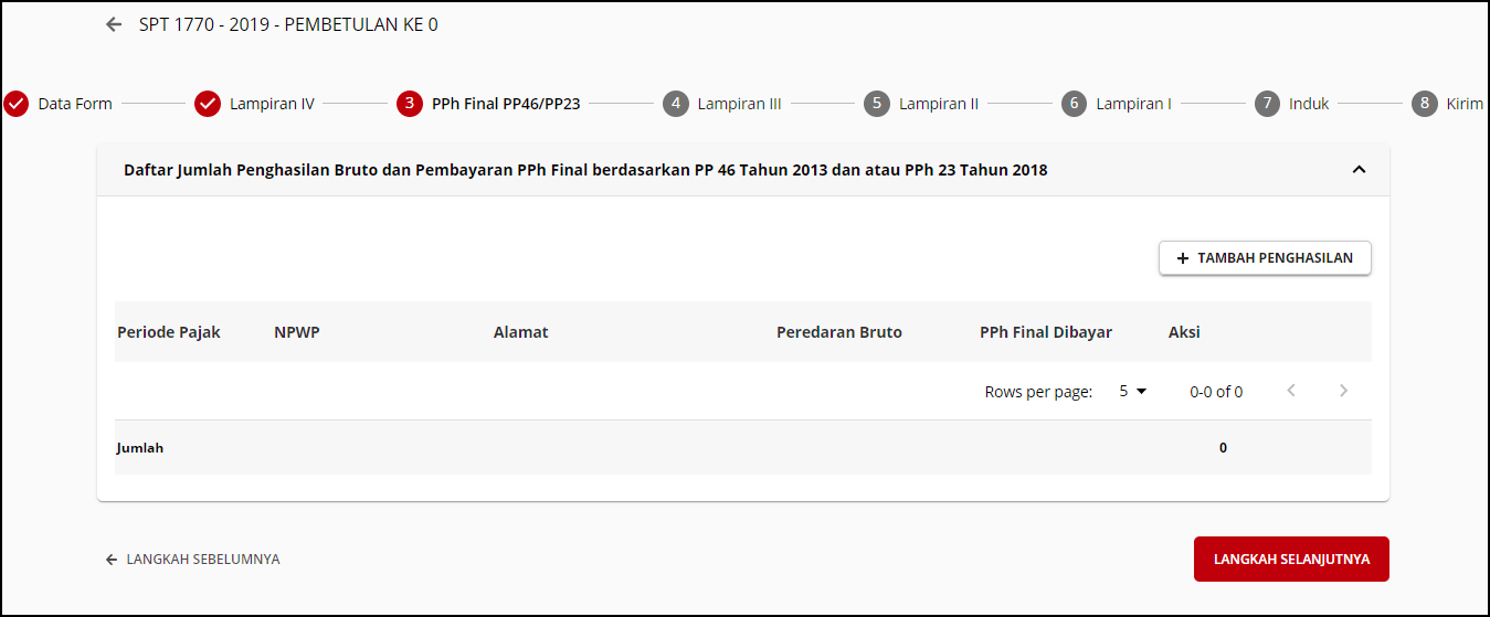 8. Silakan untuk mengisiDaftar jumlah penghasilan bruto dan pembayaran PPH Final berdasarkan PP 46 tahun 2013 dan/atau PPH 23 tahun 2018. Jika sudah lengkap klik “Langkah Selanjutnya”.