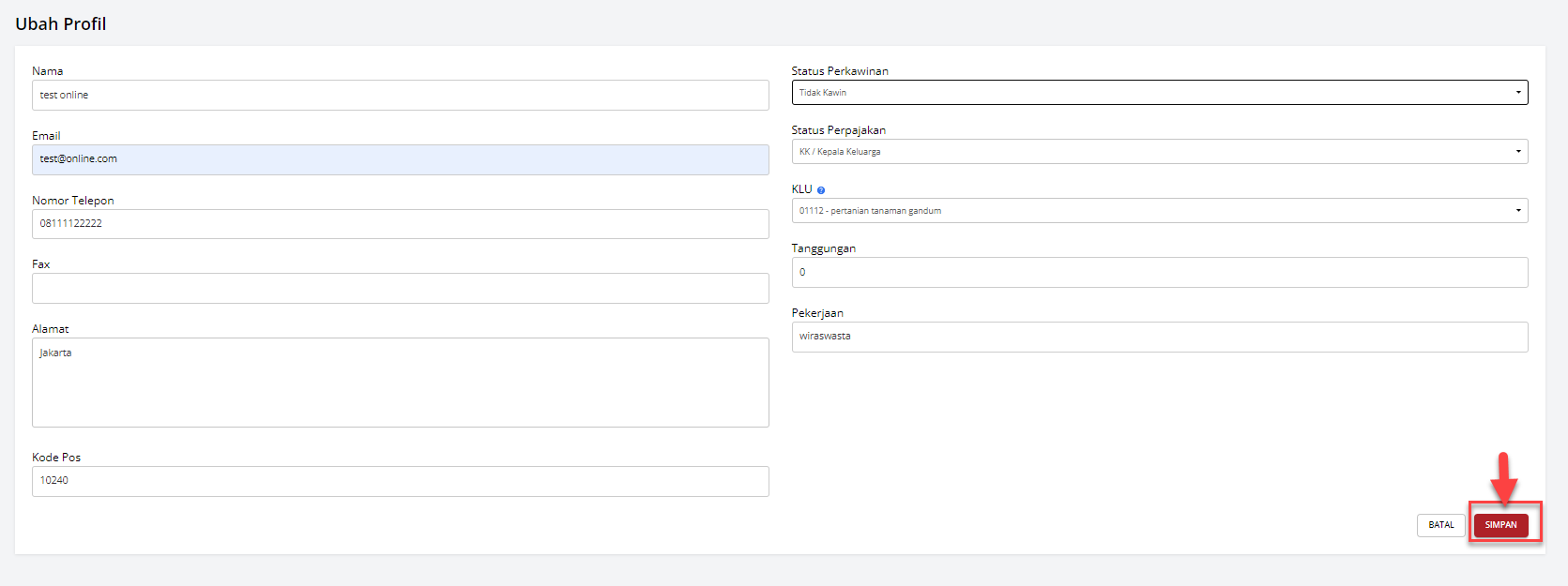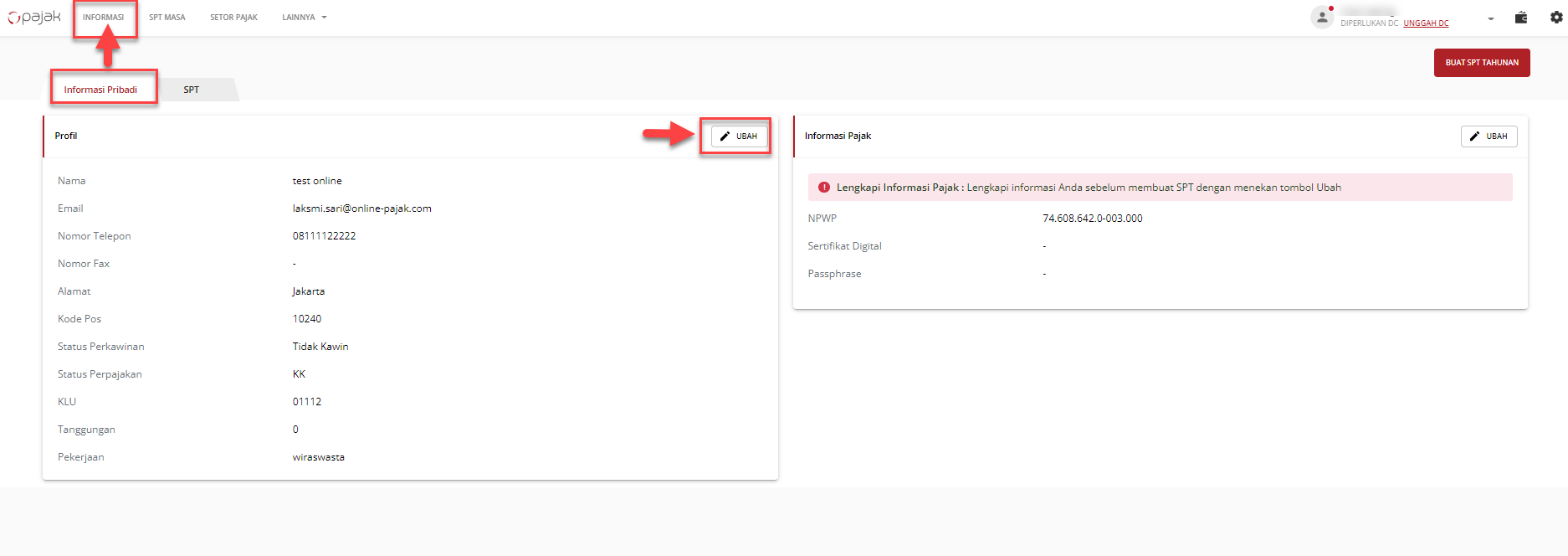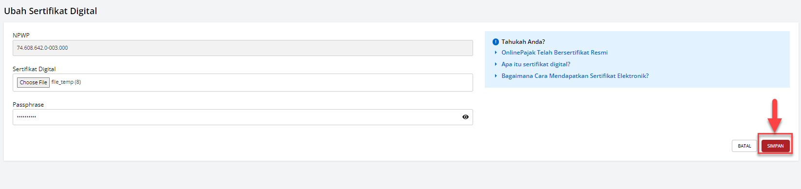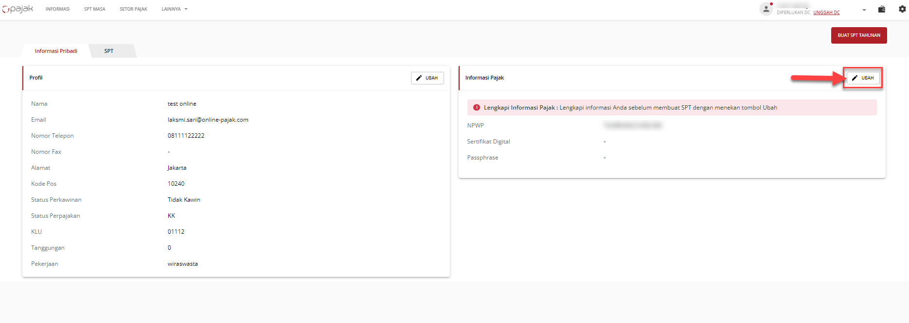 3. Pada kolom Informasi Pajak, klik “Ubah” untuk memasukan NPWP sertifikat digital dan passphrase