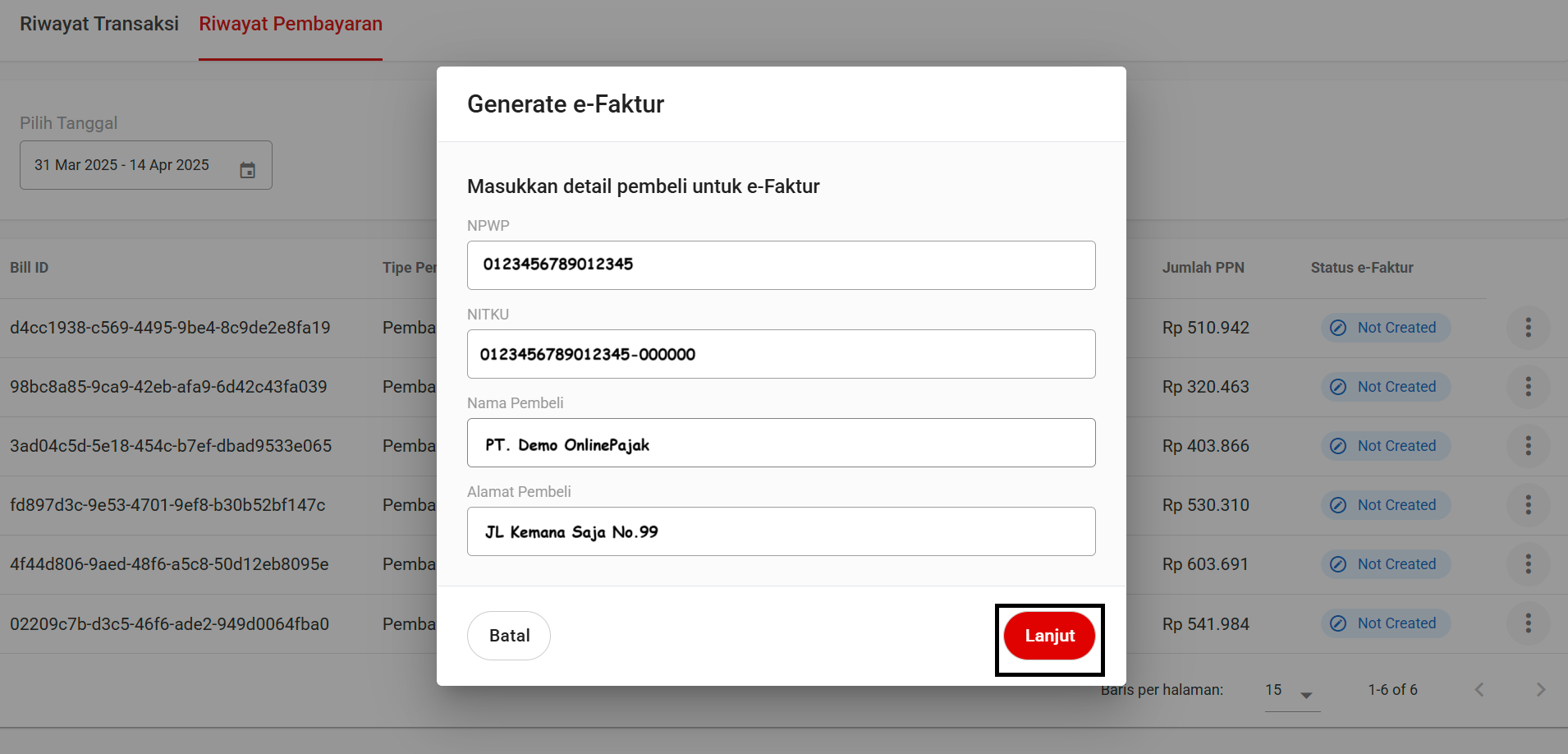 Dengan mengikuti langkah-langkah di atas, Anda dapat mengelola transaksi pajak Anda dengan mudah melalui aplikasi OnlinePajak. Jika Anda memiliki pertanyaan lebih lanjut, jangan ragu untuk menghubungi tim dukungan kami.