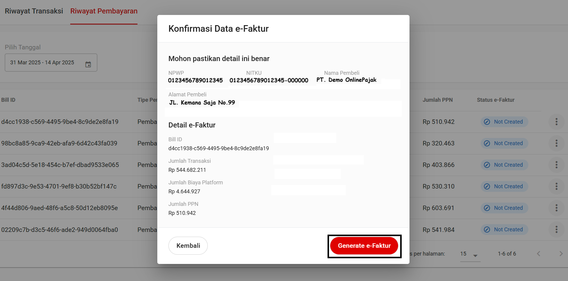 - Akan muncul konfirmasi detail faktur, setelah itu klik Generate eFaktur