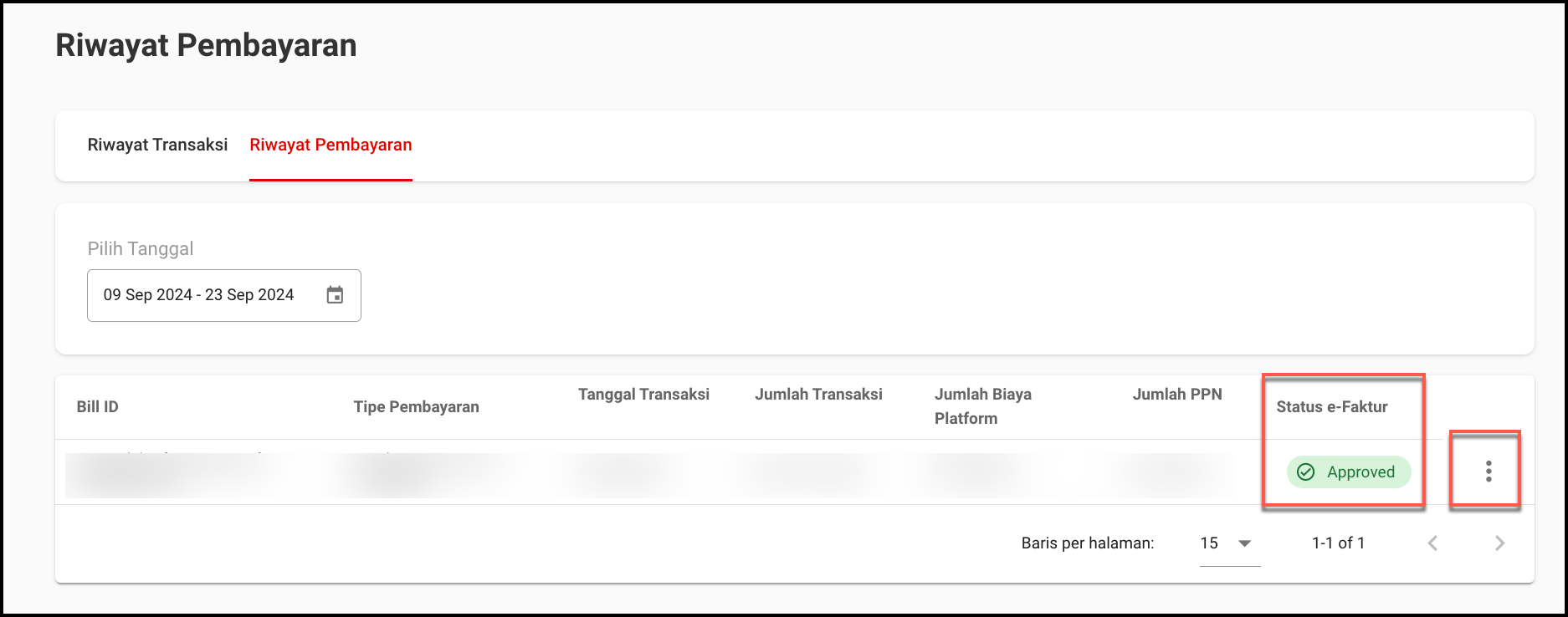 - Pastikan status eFaktur sudah Approve, kemudian klik titik tiga,