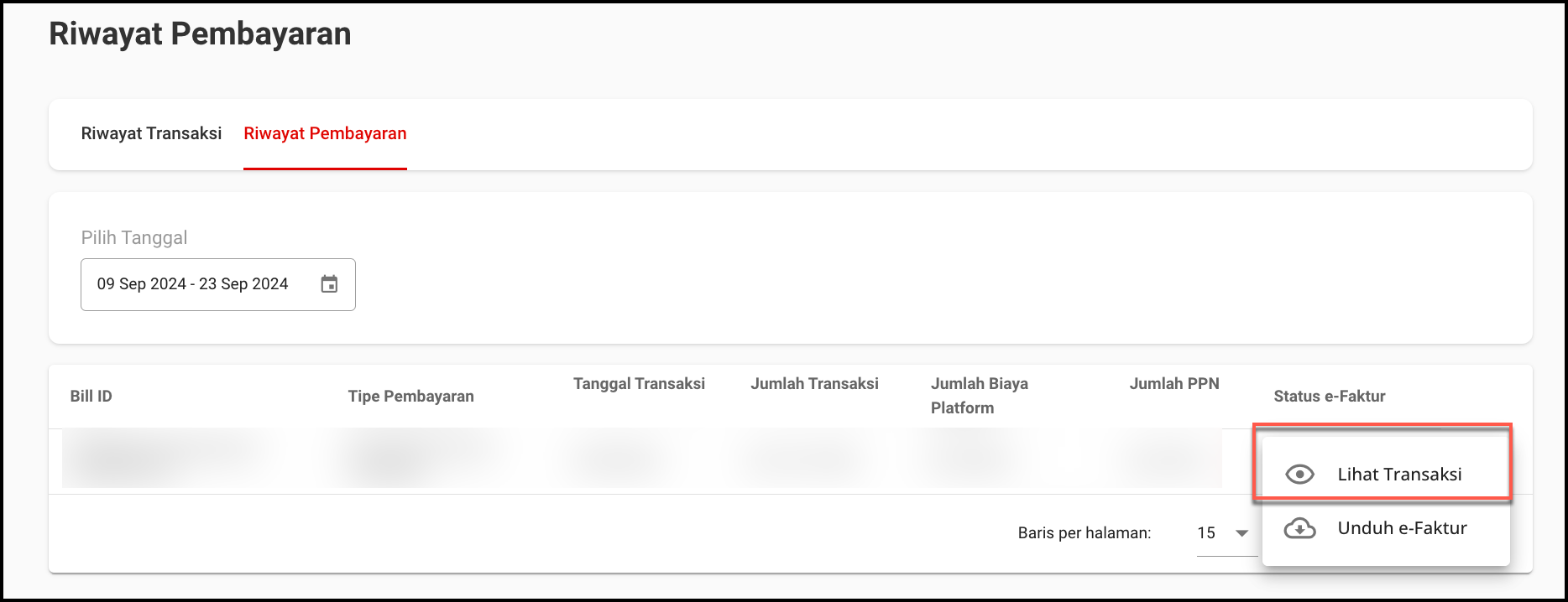 - Pilih tab “Riwayat Pembayaran”, pilih Rentang Periode Transaksi untuk menampilan faktur yang akan di Approve / Cetak.
