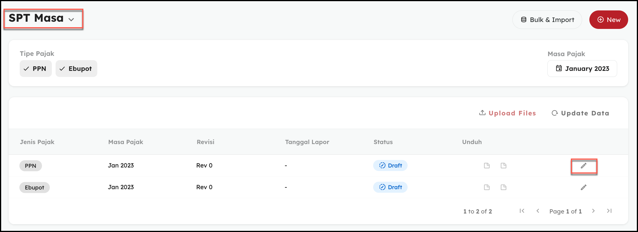 - Pilih menu SPT Masa pilih sesuai dengan masa pajak tersebut lalu klik icon pensil,