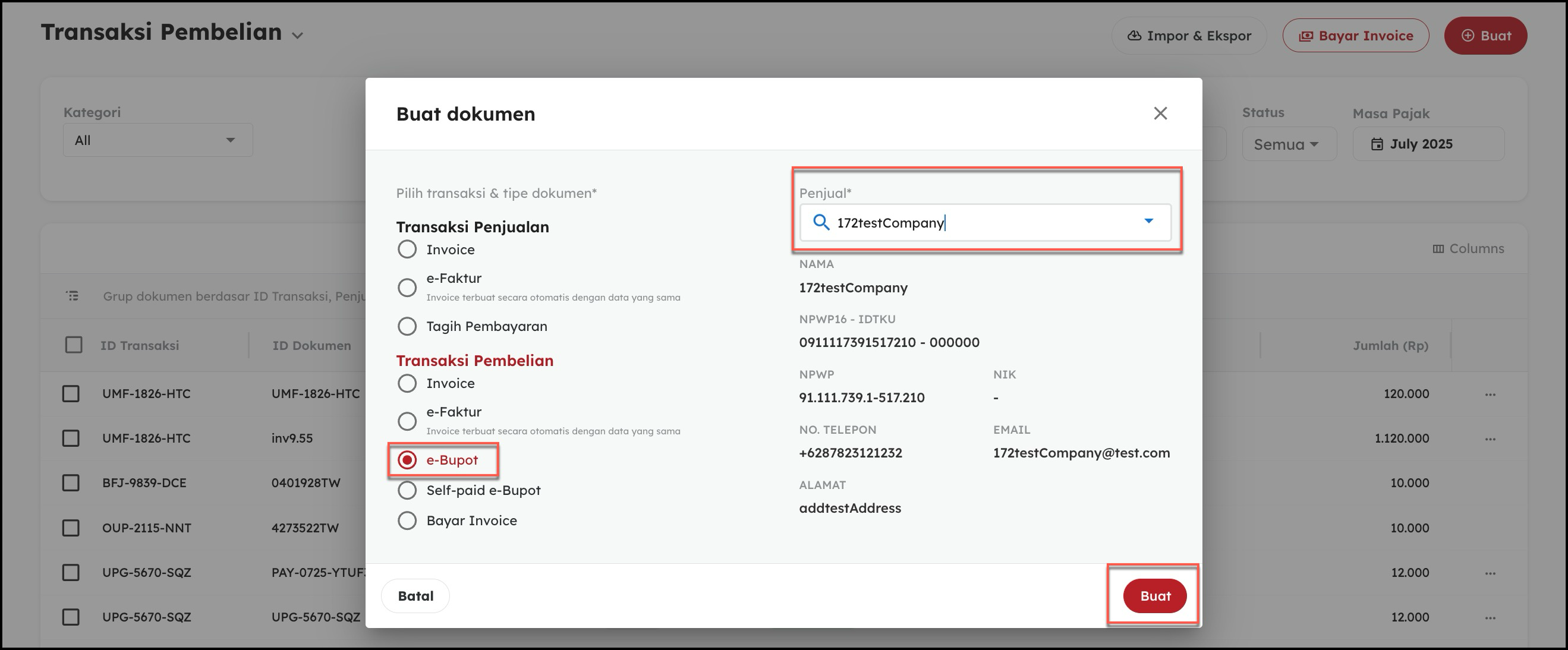 - Setelah Anda masuk pada Akun OnlinePajak. Silakan Klik menu Pembelian lalu, klik tombol Buat, dan pilih opsi e-Bupot, setelah itu pilih Nama Penjual dan klik Buat
