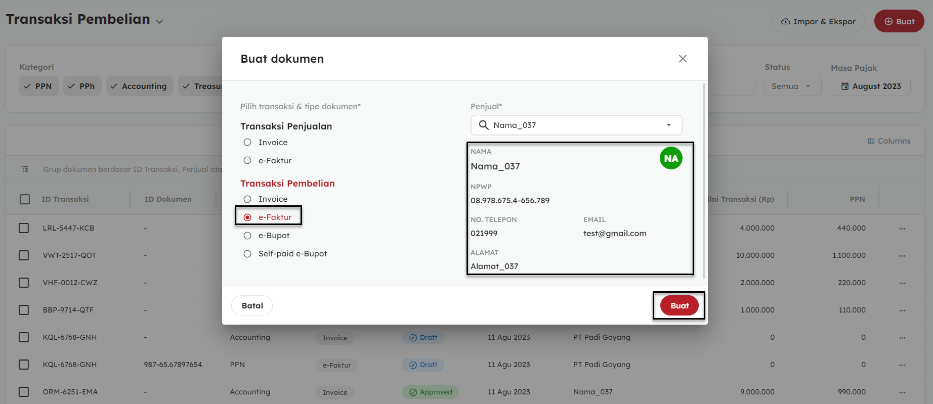 - Silakan lengkapi Detil Transaksi Pembelian dan Tipe dokumen lalu pilih Kontak Lawan Transaksi lalu klik Tombol Buat