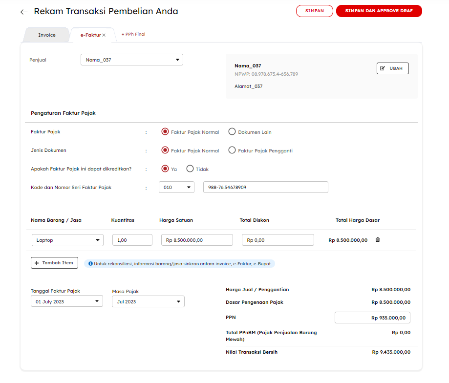 - Jika data yang diiput sudah sesuai, Silakan klik tombol Simpan untuk menyimpan Draft transaksi atau klik tombol Simpan dan Approve untuk langsung mengirimkan Approval atas transaksi tersebut