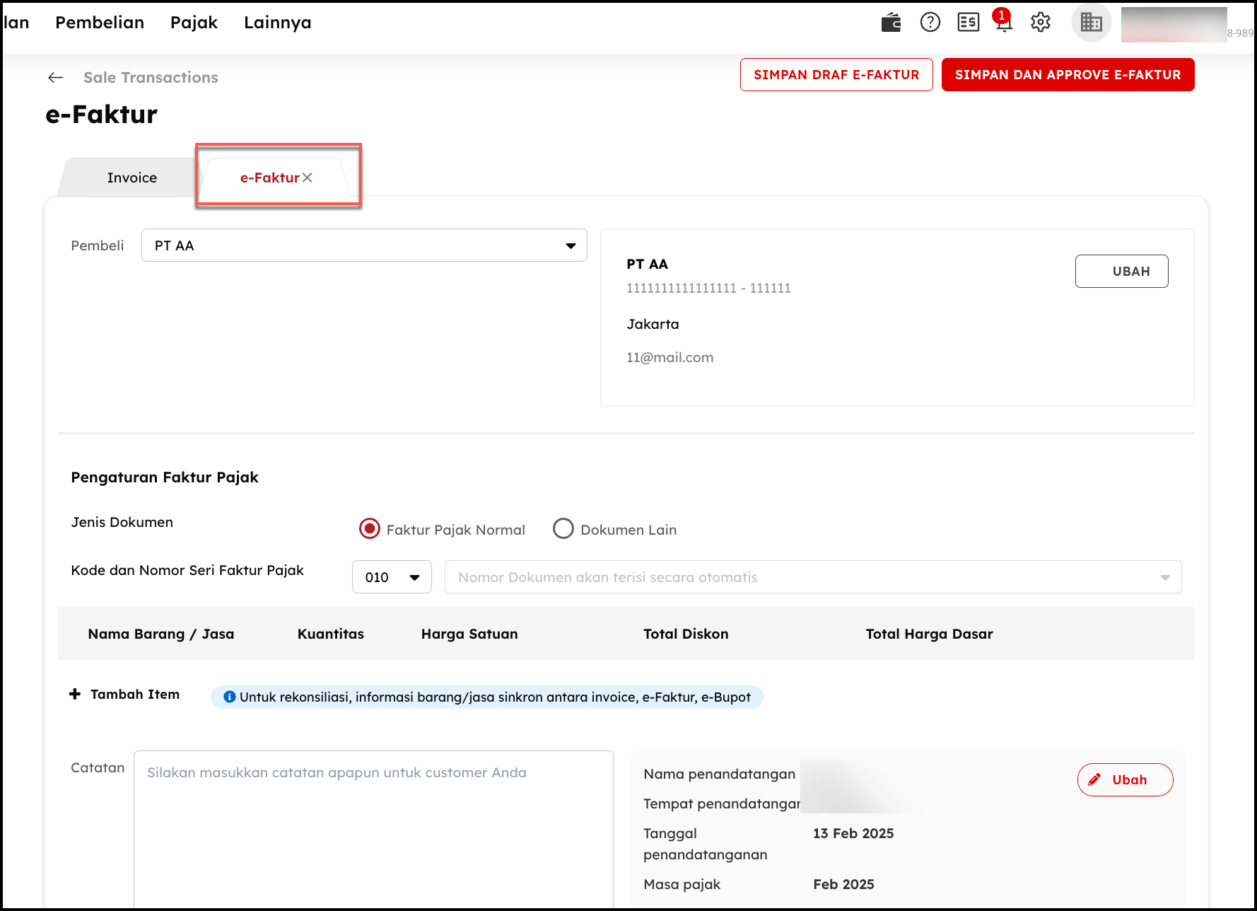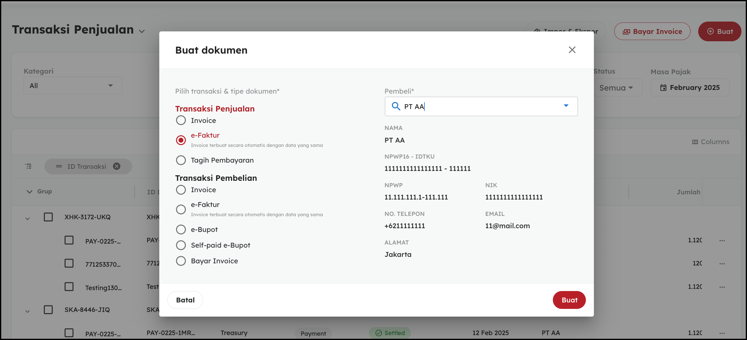 - Silakan lengkapi Detil Transaksi Penjualan dan Tipe dokumen lalu pilih Kontak Lawan Transaksi lalu klik Tombol Buat