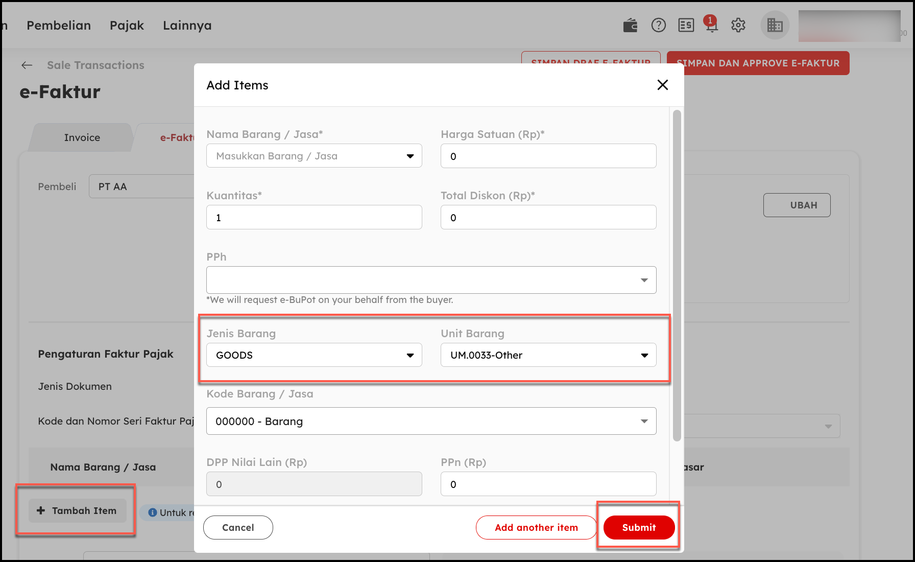 - Klik Tambah Item, pastikan Jenis Barang dan Unit Barang sesuai.