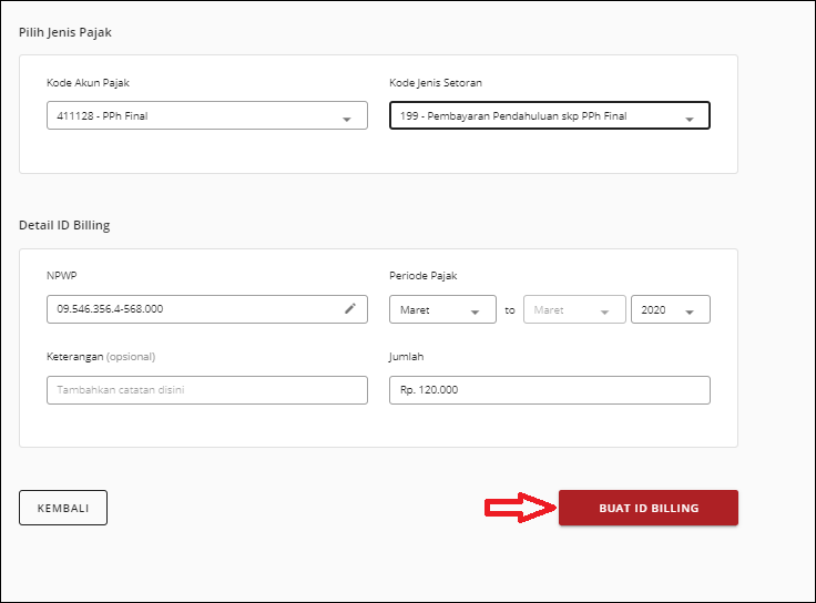 - Setelah semua terisi, kemudian Klik “Buat ID Billing”
