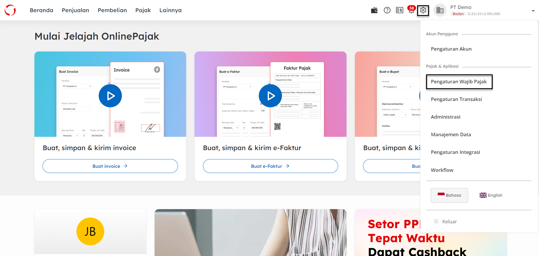- Klik logo Gear, klik menu Pengaturan Wajib Pajak;
