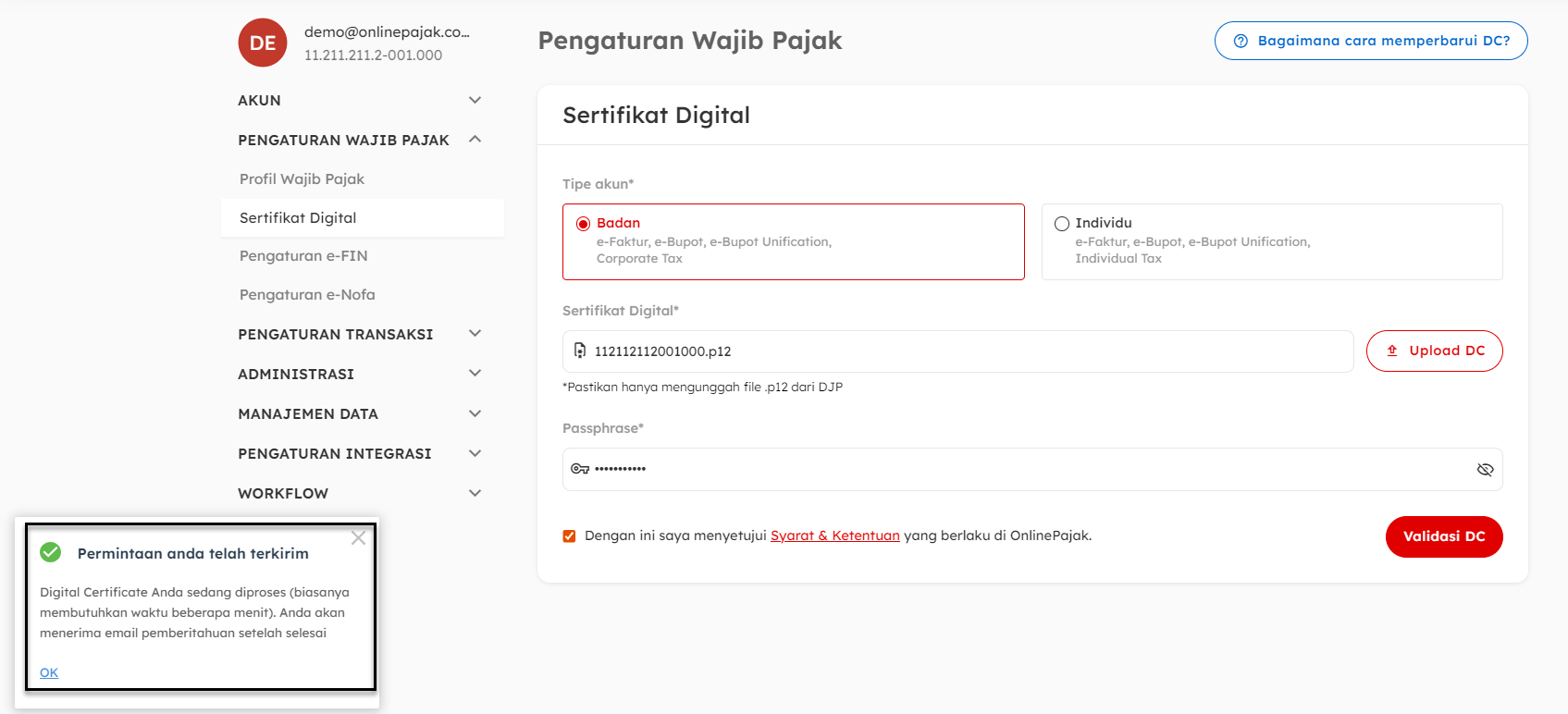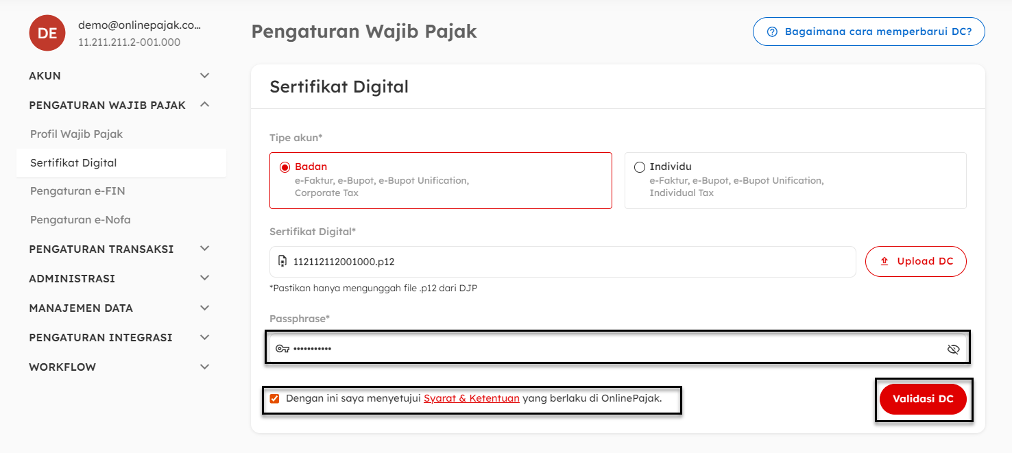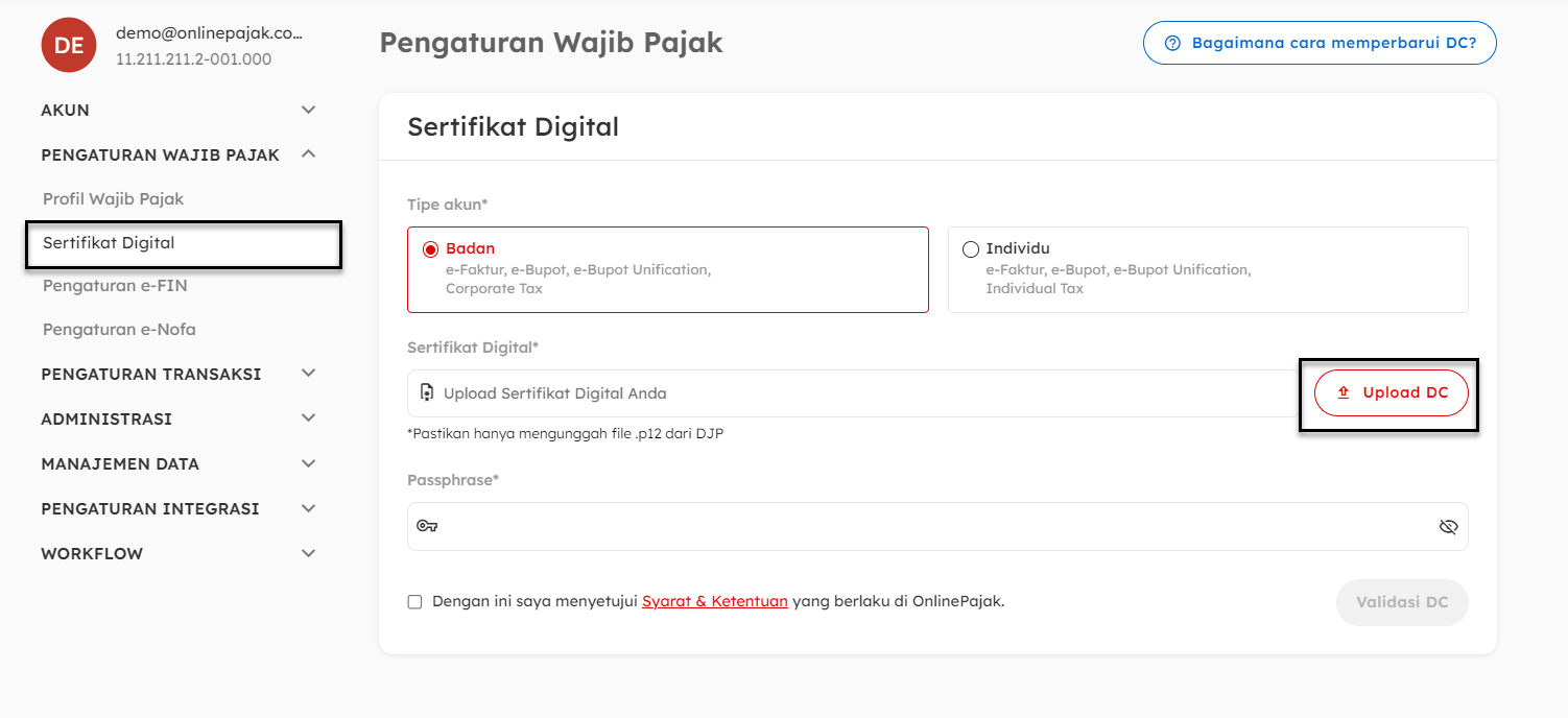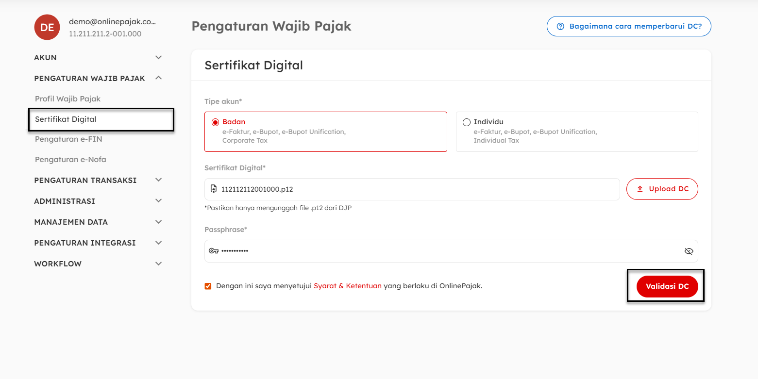 - Unggah file Sertifikat Digital terbaru, input Passphrase, beserta Centangkotak persetujuan, kemudian klik Validasi DC.