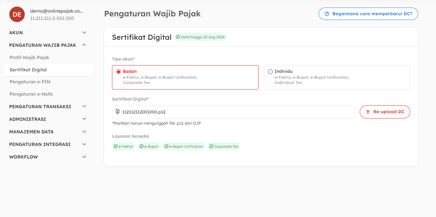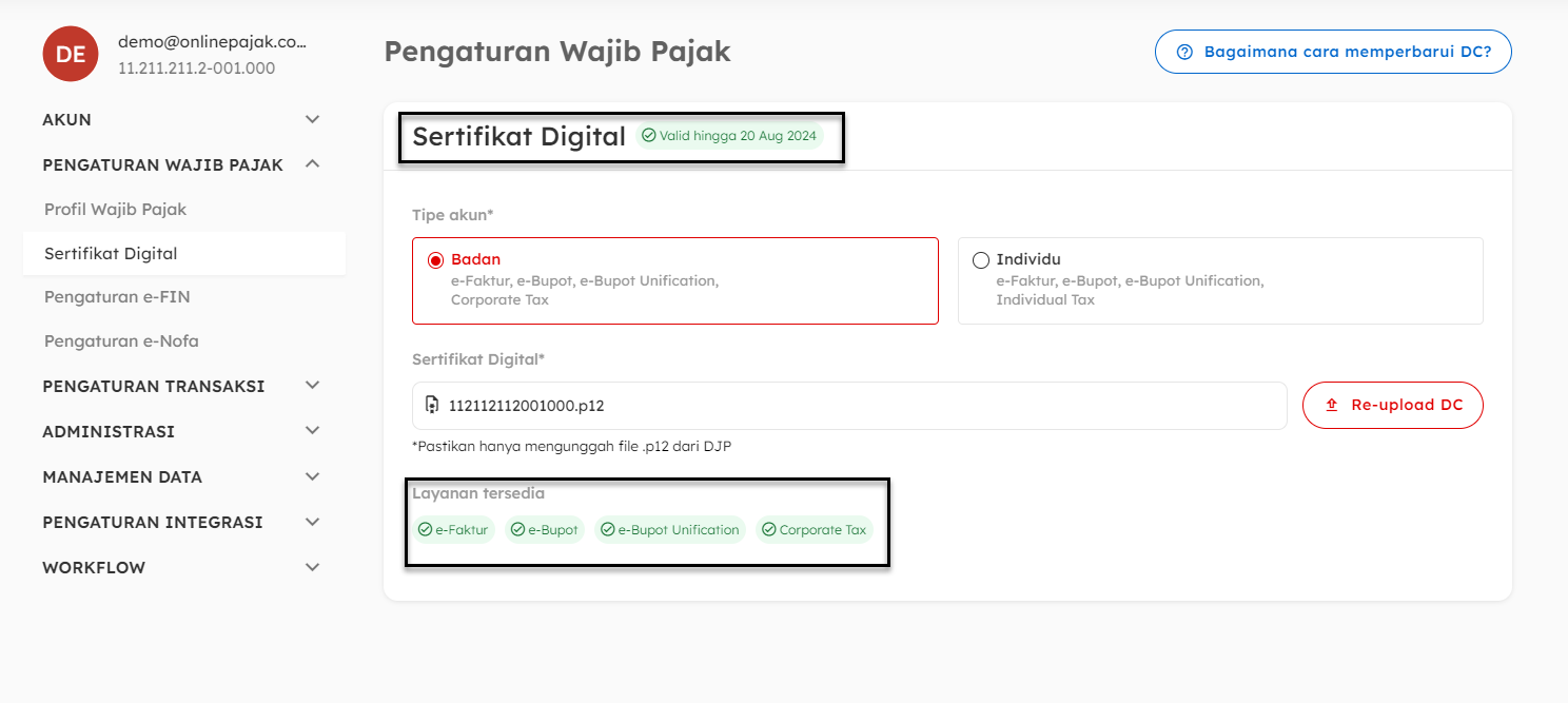 - Klik tombol Re-Upload untuk memperbaharui Sertifikat Digital Anda