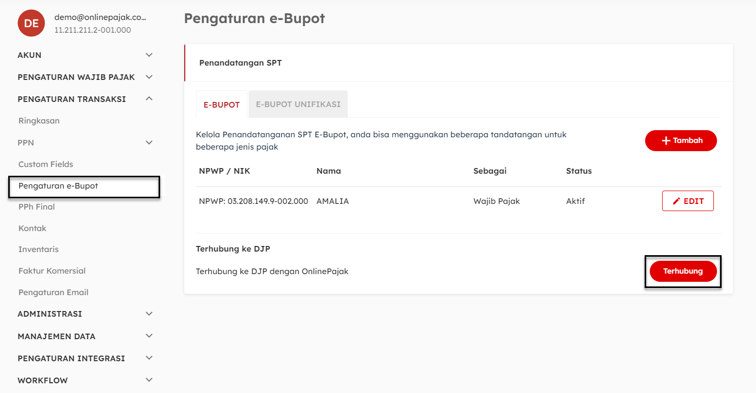 - Pada bagian Terhubung ke DJP Klik tombol Terhubung untuk menghubungkan Sertifikat Digital Anda dengan Layanan eBupot OnlinePajak
