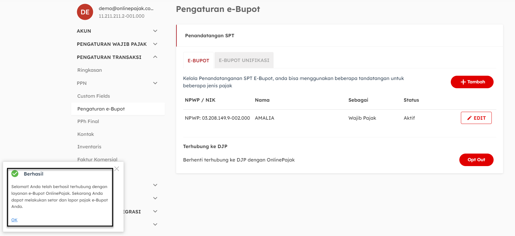 - Akan muncul Pop Up Pemberitahuan bahwa Anda telah berhasil terhubung dengan Layanan eBupot OnlinePajak